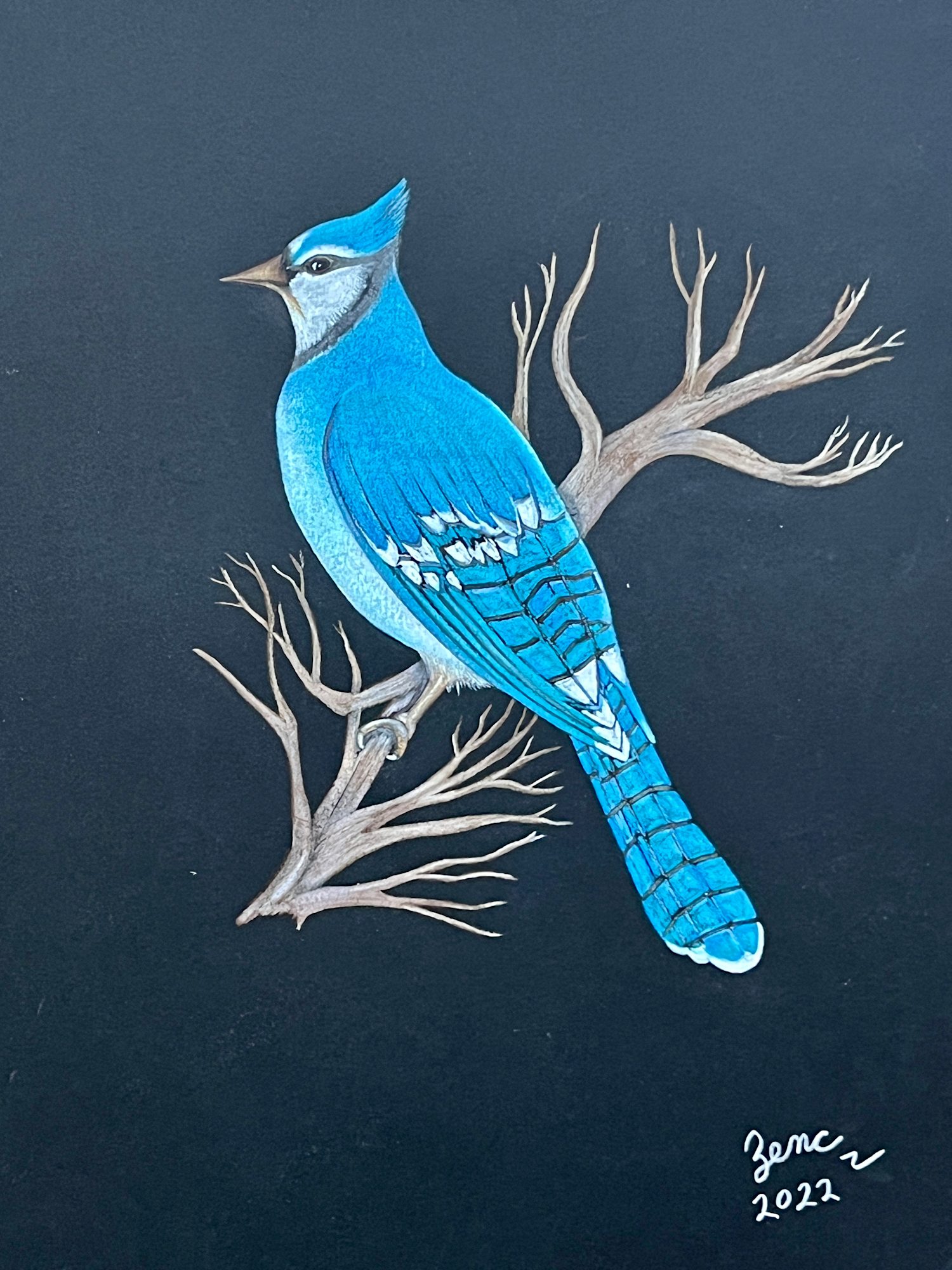 Blue-J was created out of the beauty of such a beautiful bird, the wonderful blue color that God gave this amazing animal. The name of this piece was not the bird, but for those people who are just kickin back, enjoying the beauty of this beautiful bird. God created some amazing creatures, don't you all think so? Let's all respect life. Whether animals or human beings. Look into the eye of the bird. He is looking back.