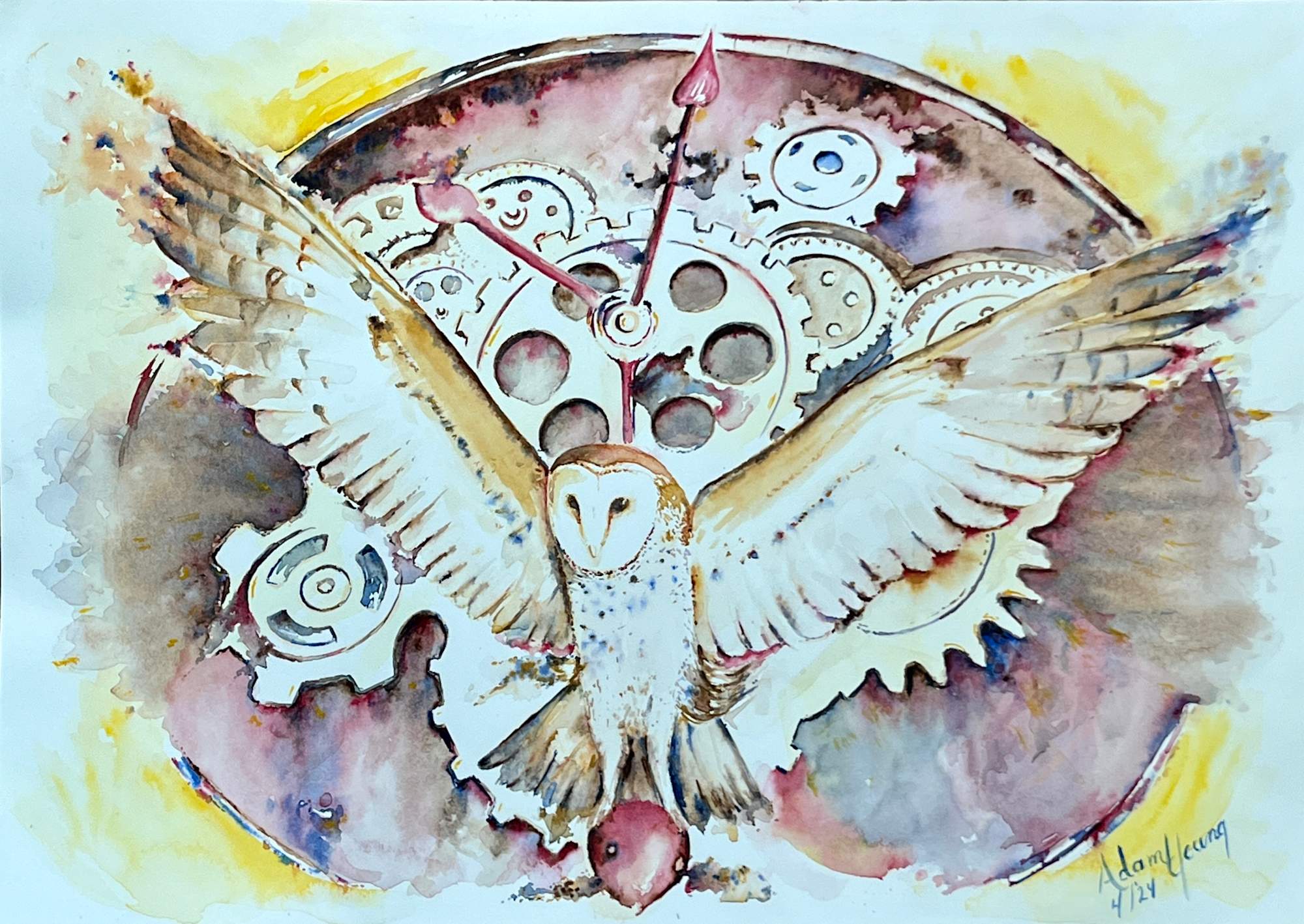 A barn owl symbolizing wisdom is the center attraction. The owl is standing on the second hand of an exposed clock. The colors are a mix of ultramarine blue, Alz. crimson, yellow, yellow ochre and burnt umber.