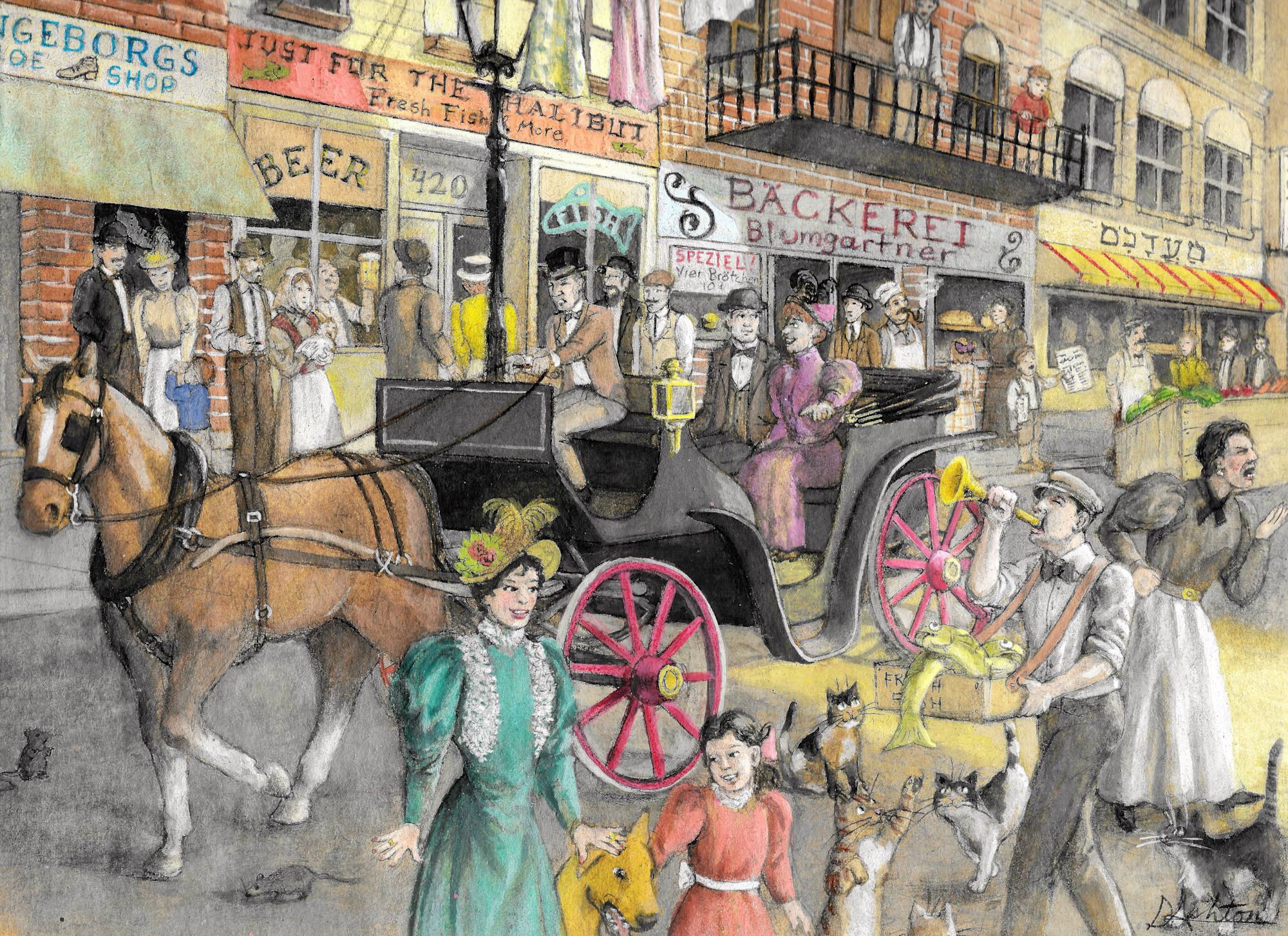 As you see, I wanted to illustrate a variety of immigrants who came to America around this time. I was thinking of titling it, “New Arrivals” or something. LIke another street scene I did before this, I tried a big swatch of light going down the middle. I think it came out nice.