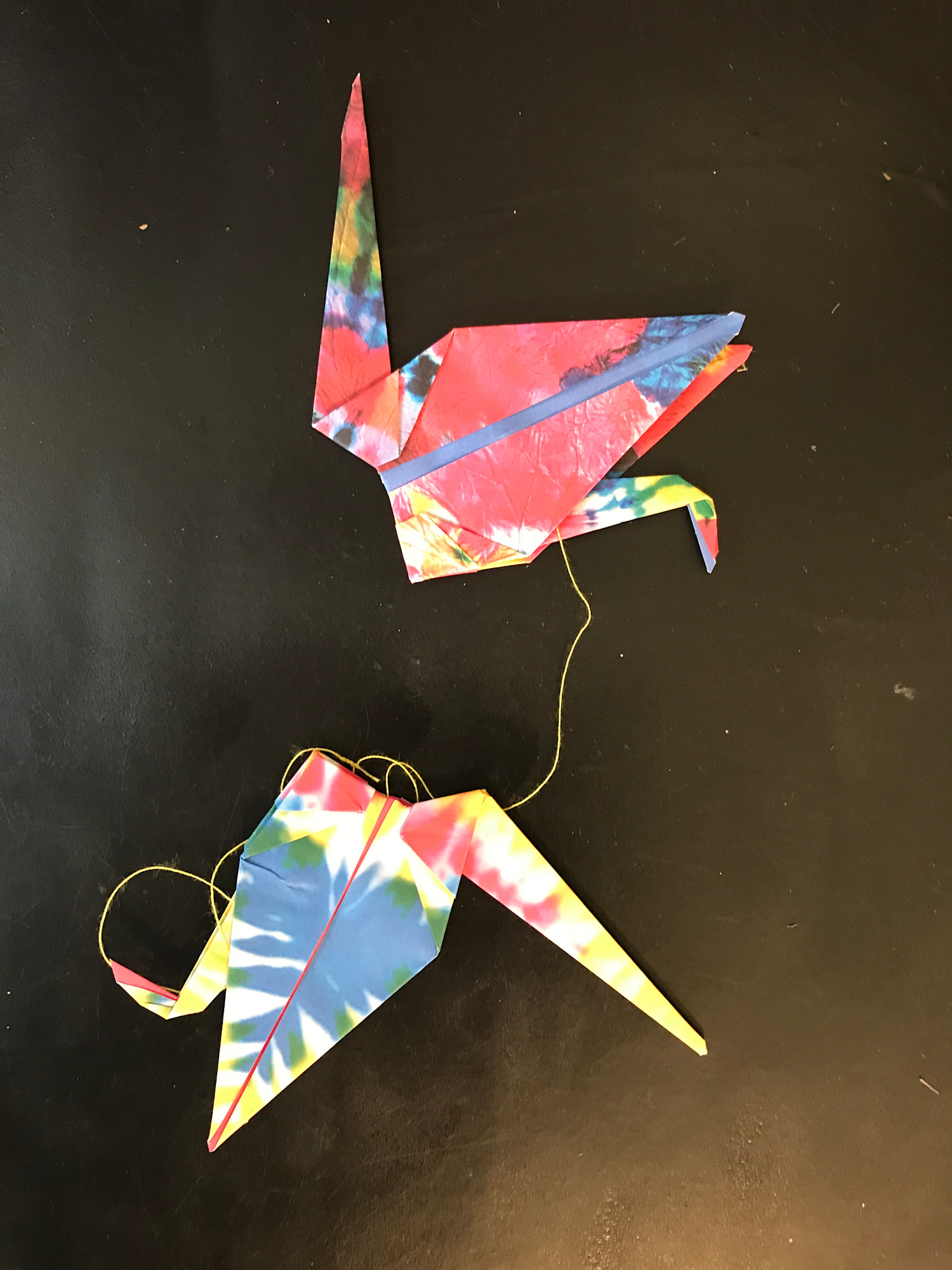 2 paper cranes in one mobile, ~3" x 5" ea.