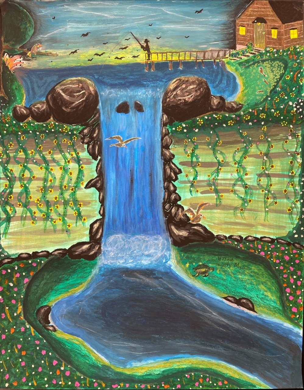I have this painting of a special place in my mind of a waterfall and a man fishing at his home in peace. The fisherman is listening to the birds and water and breathing the good air.
