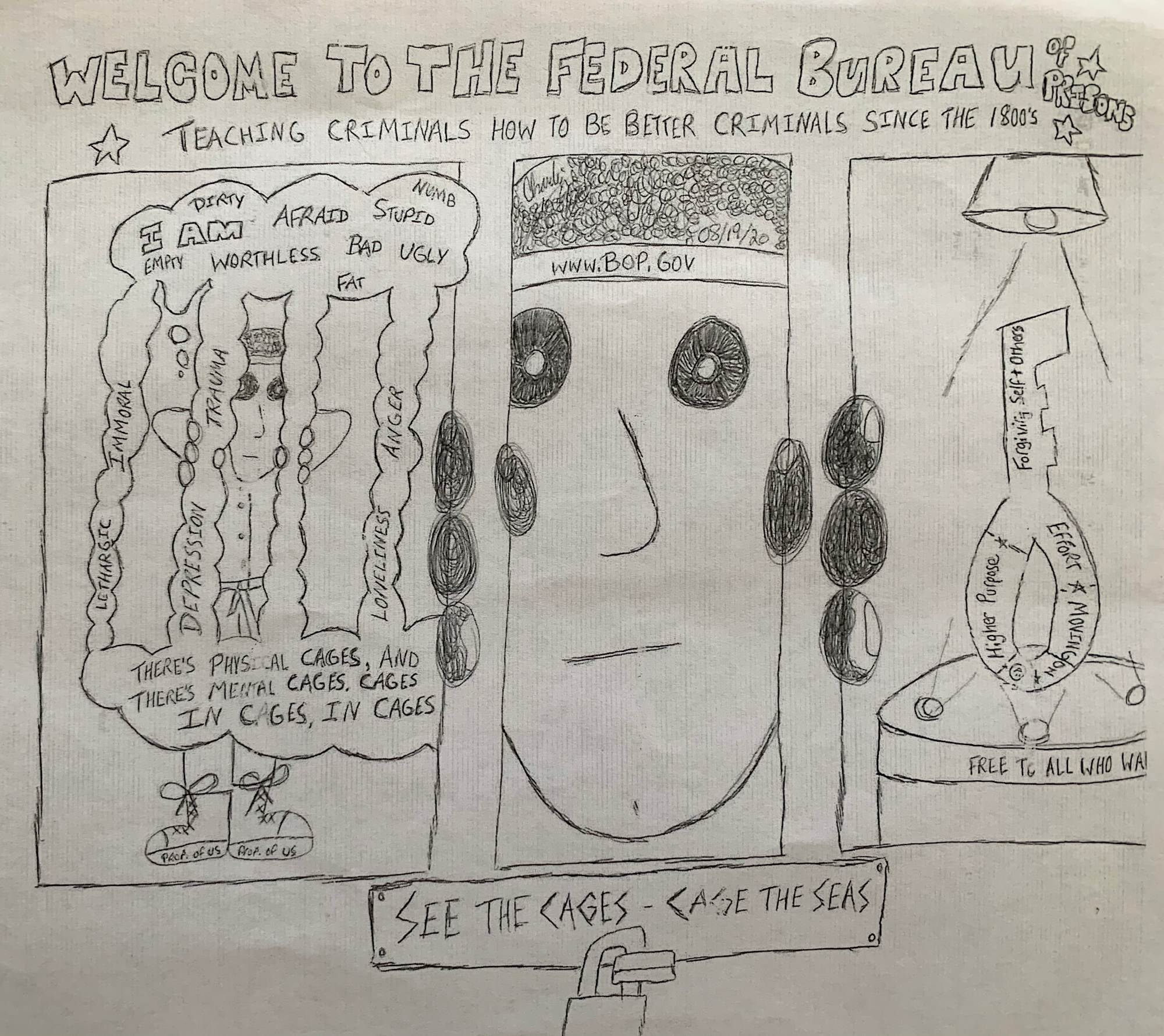 My mentor latched on to the "jail within a jail" concept. So I created "Welcome to www.bop.gov" cartoon. It's two cell-mates (cellies) who are confined in a cell, looking out. Thing is, there's a prisoner who is also caged in a mental cell. I've heard that the left panel alone suffice. But this is from people who've never been enslaved (incarcerated). To be able to look past your physical incarceration is just self-inflicted delusion. But that's the reason for the last panel. It's a key inside the cell, not outside, and it sets the flow of potential free. I feel any raindrop has the potential to bring the force of the sea. Yet potential is nothing if not tapped into.