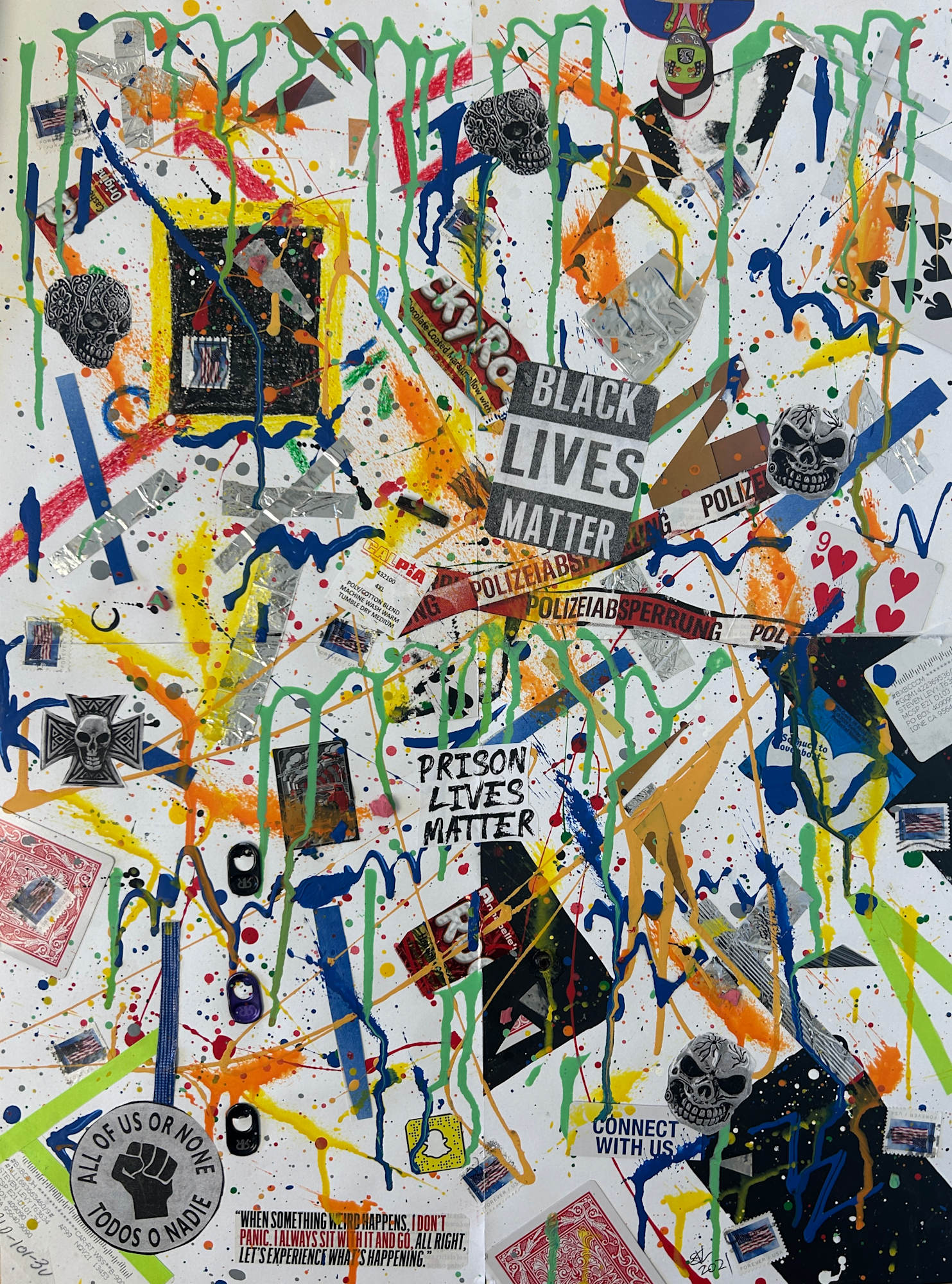 - Collaged images, ink, paint, foil, beans, pull tabs, lotta love