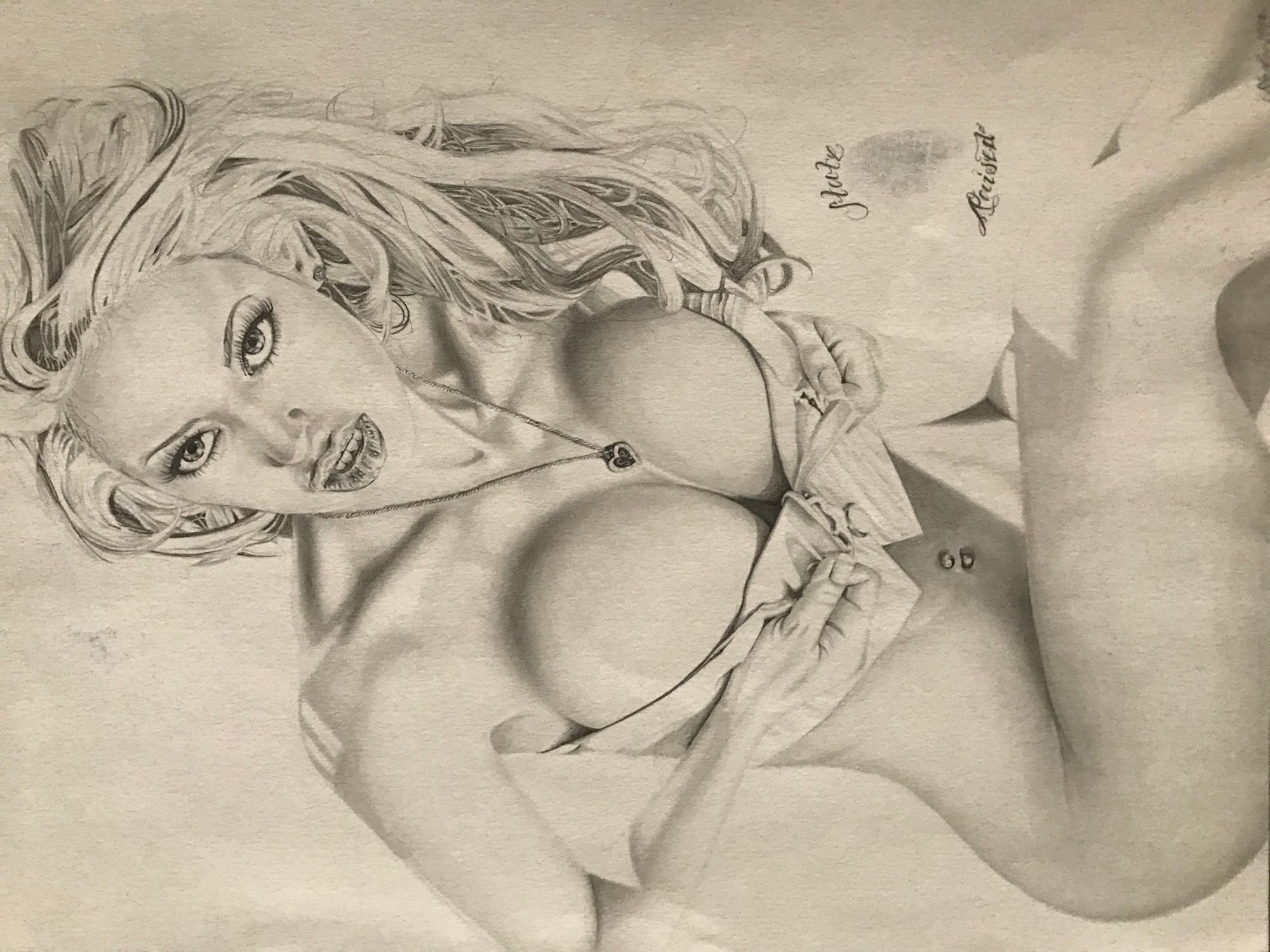 Drawing captures a beautiful woman posed in a provocative way wearing a heart necklace with the pendant lying between her breasts.