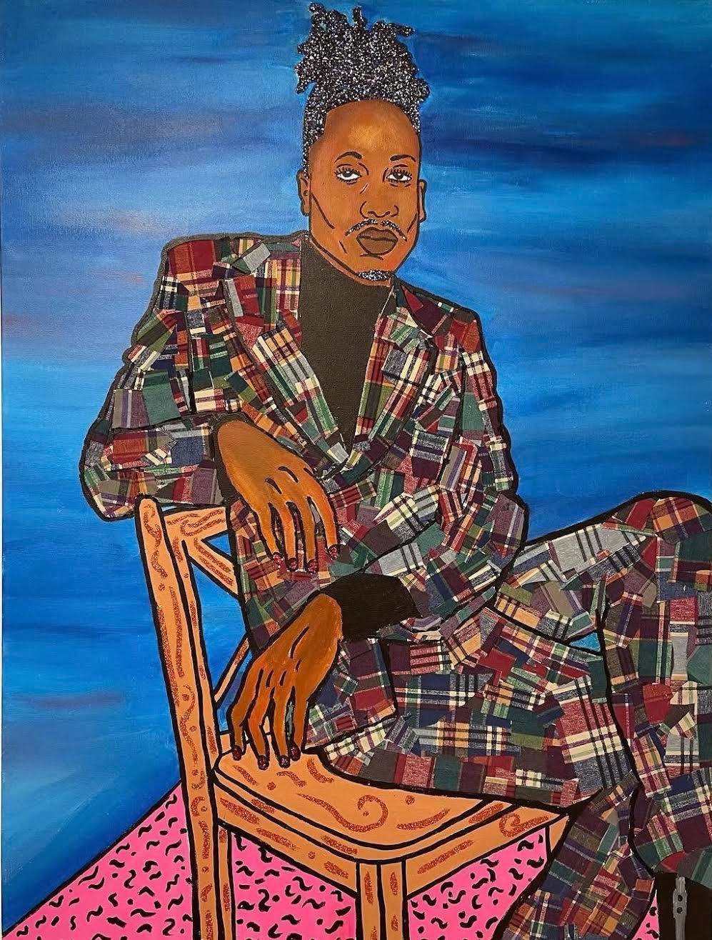 acrylic on canvas with fabric and glitter