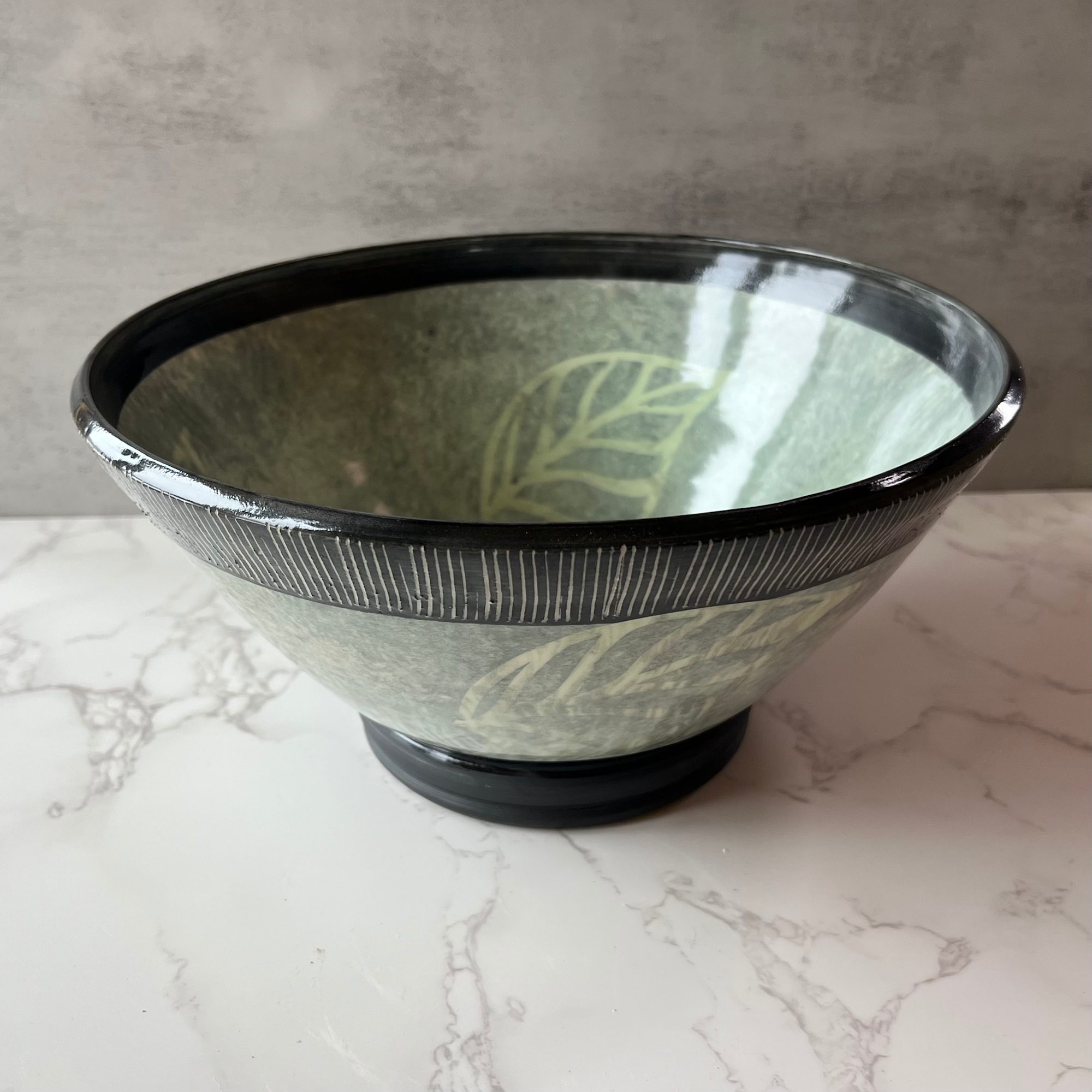 Sage-green serving bowl with black rim and foot with a stenciled leaf motif.