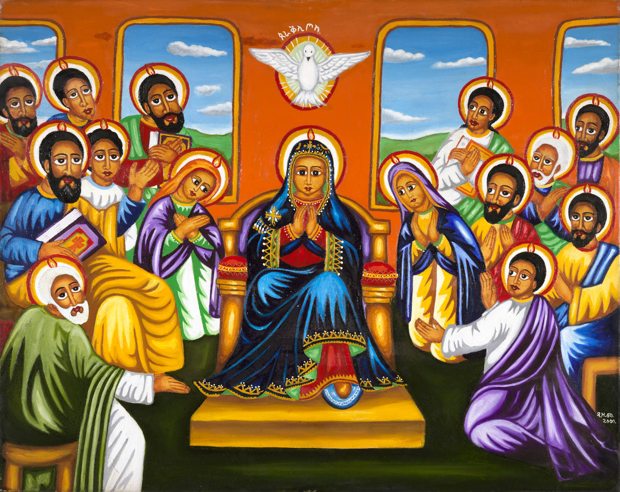 This striking oil painting by Haile Maskel Samuels—titled Parakletos (Pentecost)—vividly captures the descent of the Holy Spirit in the Upper Room, as described in Acts 2. Painted in 2000, this work is steeped in Ethiopian Orthodox tradition and rendered in radiant colours and spiritual reverence.