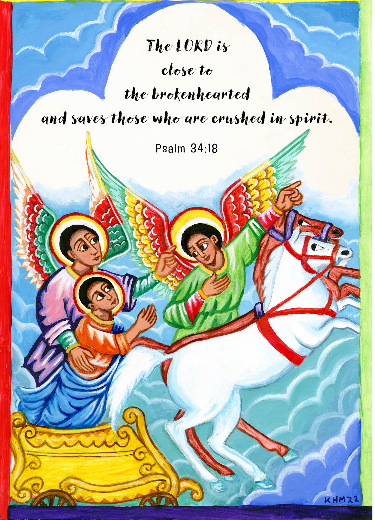 Experience the celestial journey of St. Kyriacos guided by two angels, including St. Rafael, in a divine chariot to Heaven. This moving watercolor artwork captures Psalm 34:18: