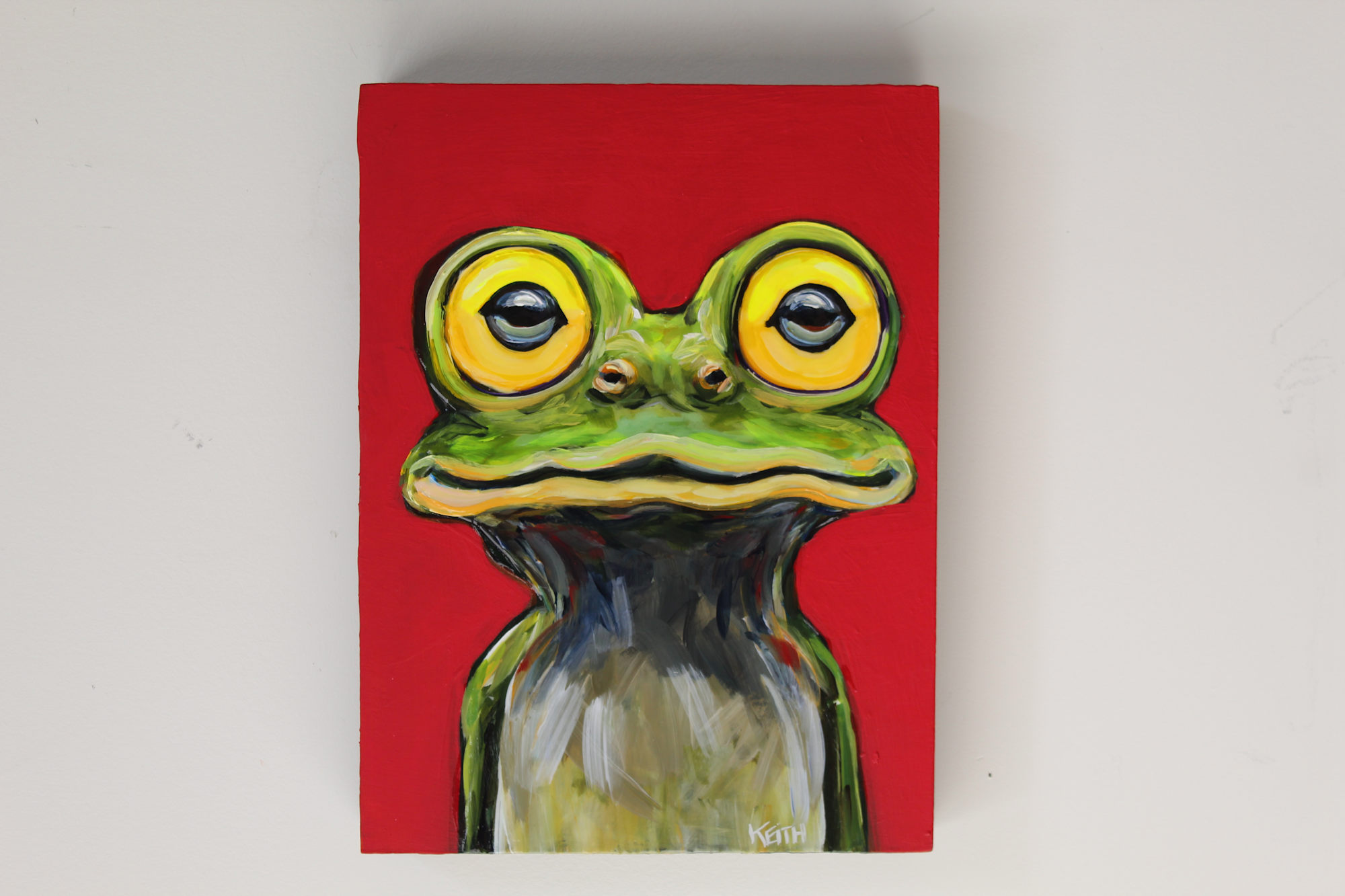 Painted using a flat matte paint for the background in dark cadmium red, to compliment the frogs bright green and layered glossy finish that gives it a 3d effect