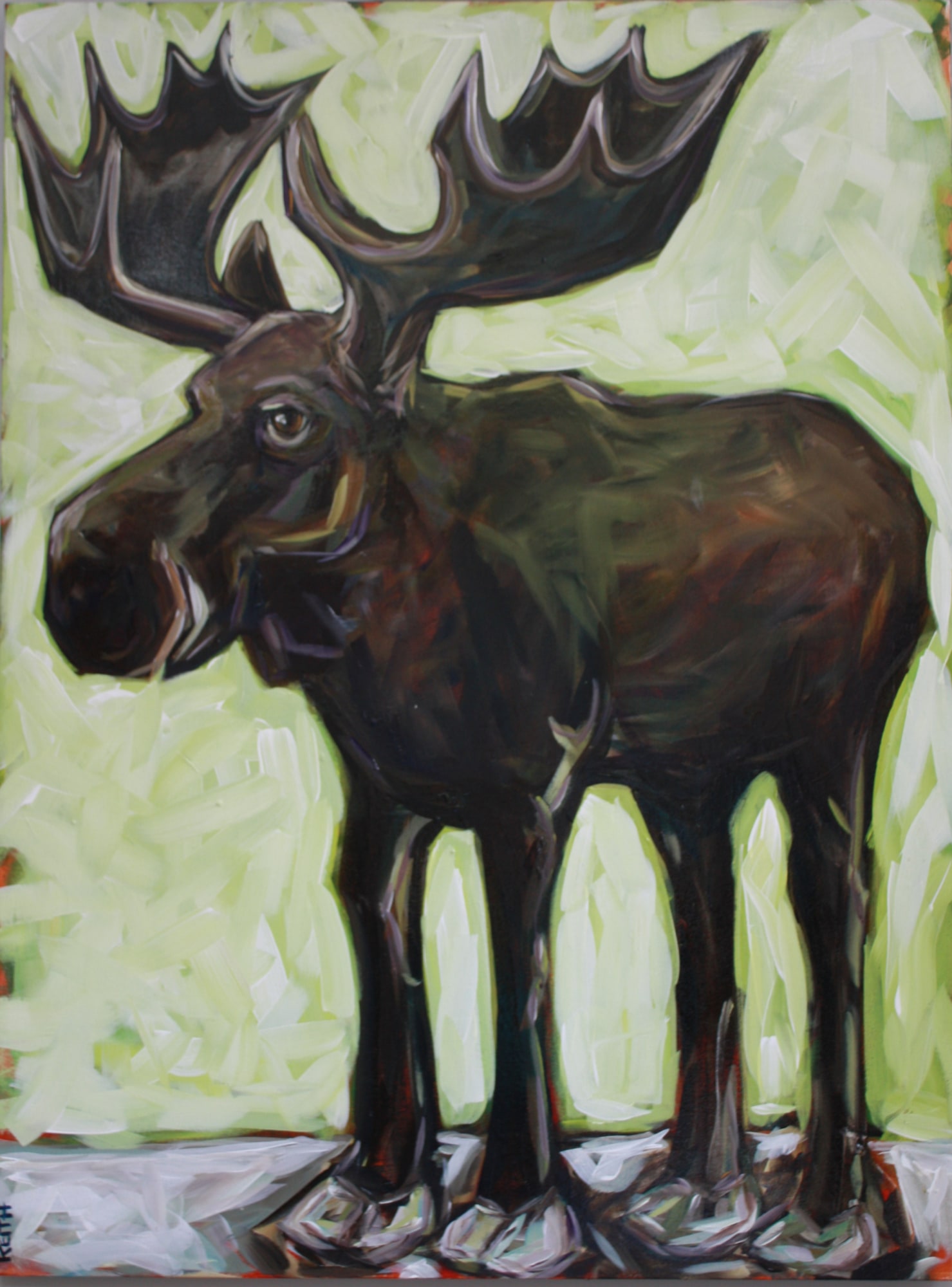 John is the largest Moose (and painting) I have ever finished. It was fun to "get loose" and paint on such a huge canvas. I love how his colours seem to just "pop" against the green background
