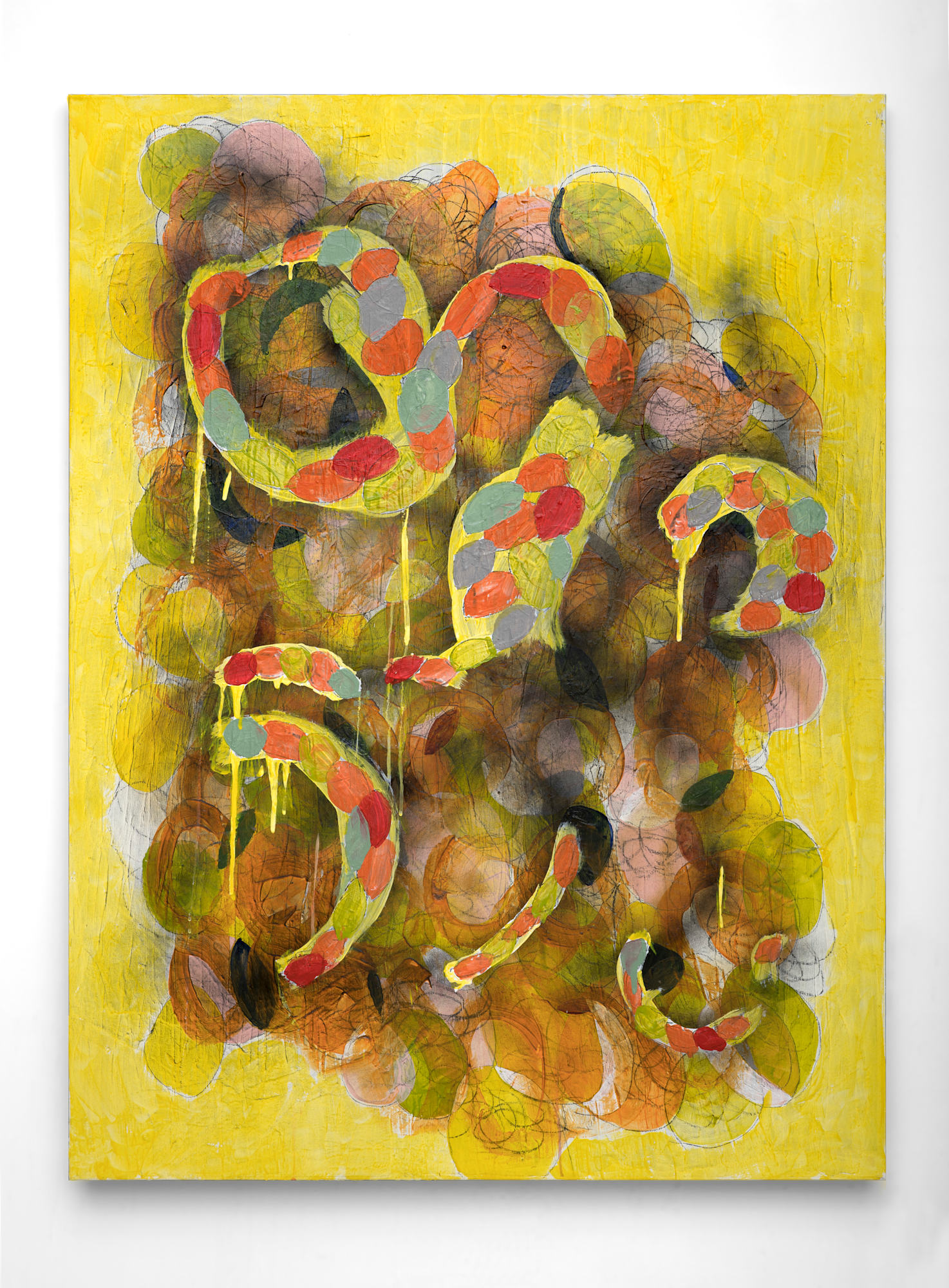 Acrylic, gesso, spray paint, paper and pencil on canvas