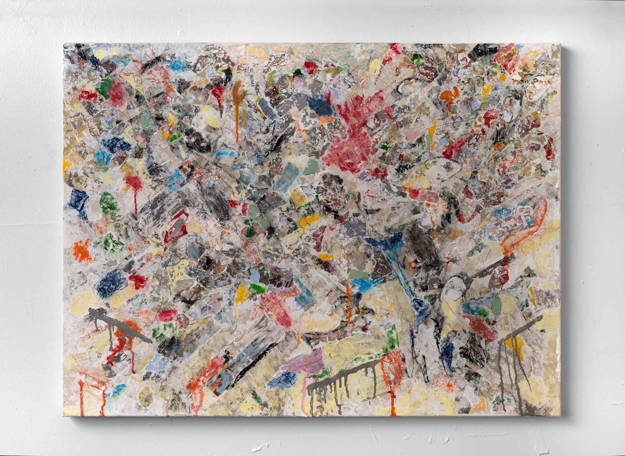 Acrylic, gesso, paper, oil stick, charcoal, and graphite on canvas