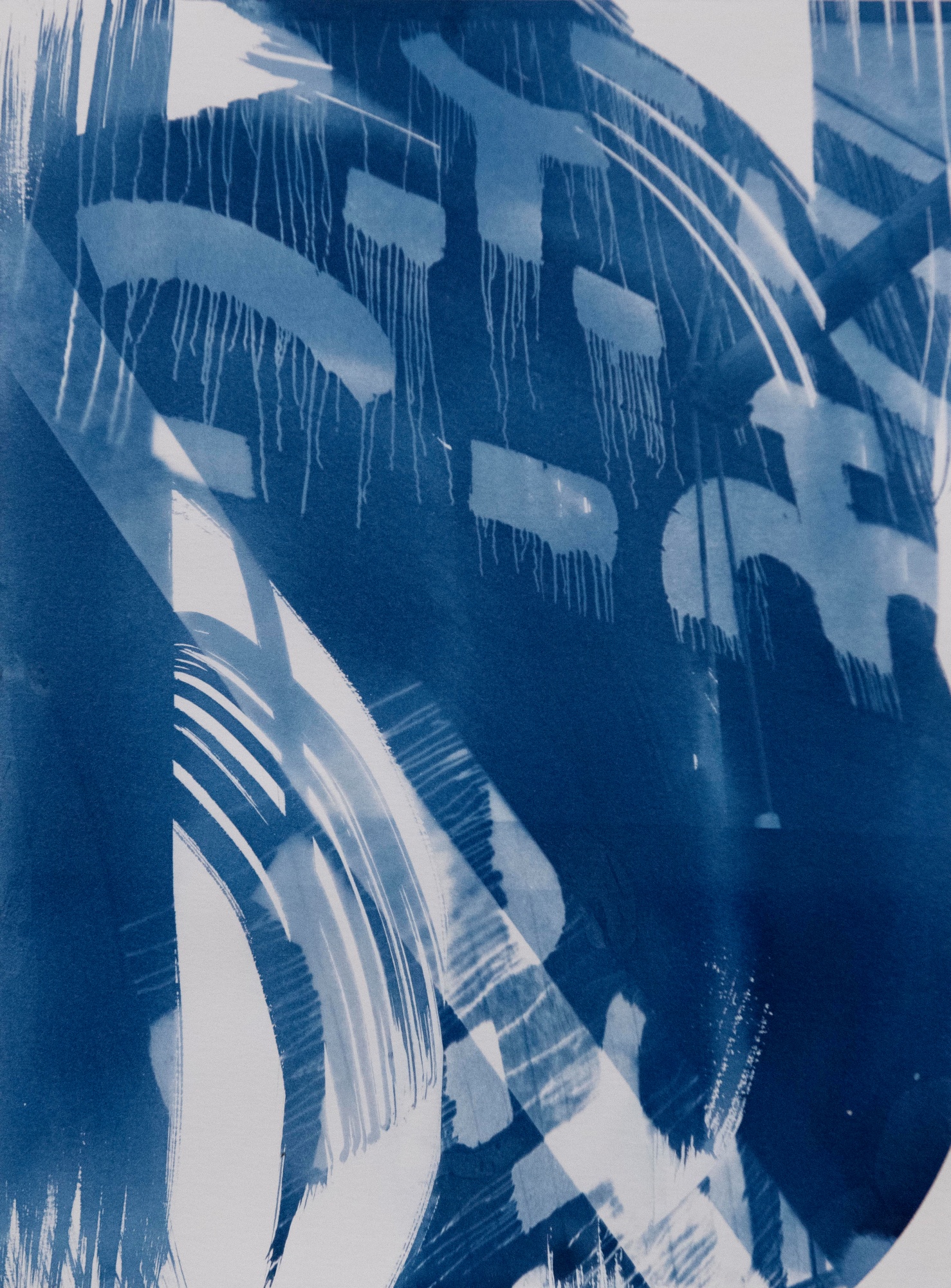 Original art abstract cyanotype crafted from photographic films created by Karen Johanson and inspired by city architecture and streets. 9 x 12 inches. Framed with Bainbridge polished silver metal frame and acid-free mat board: Final framed dimensions are 17 x 20 inches.
