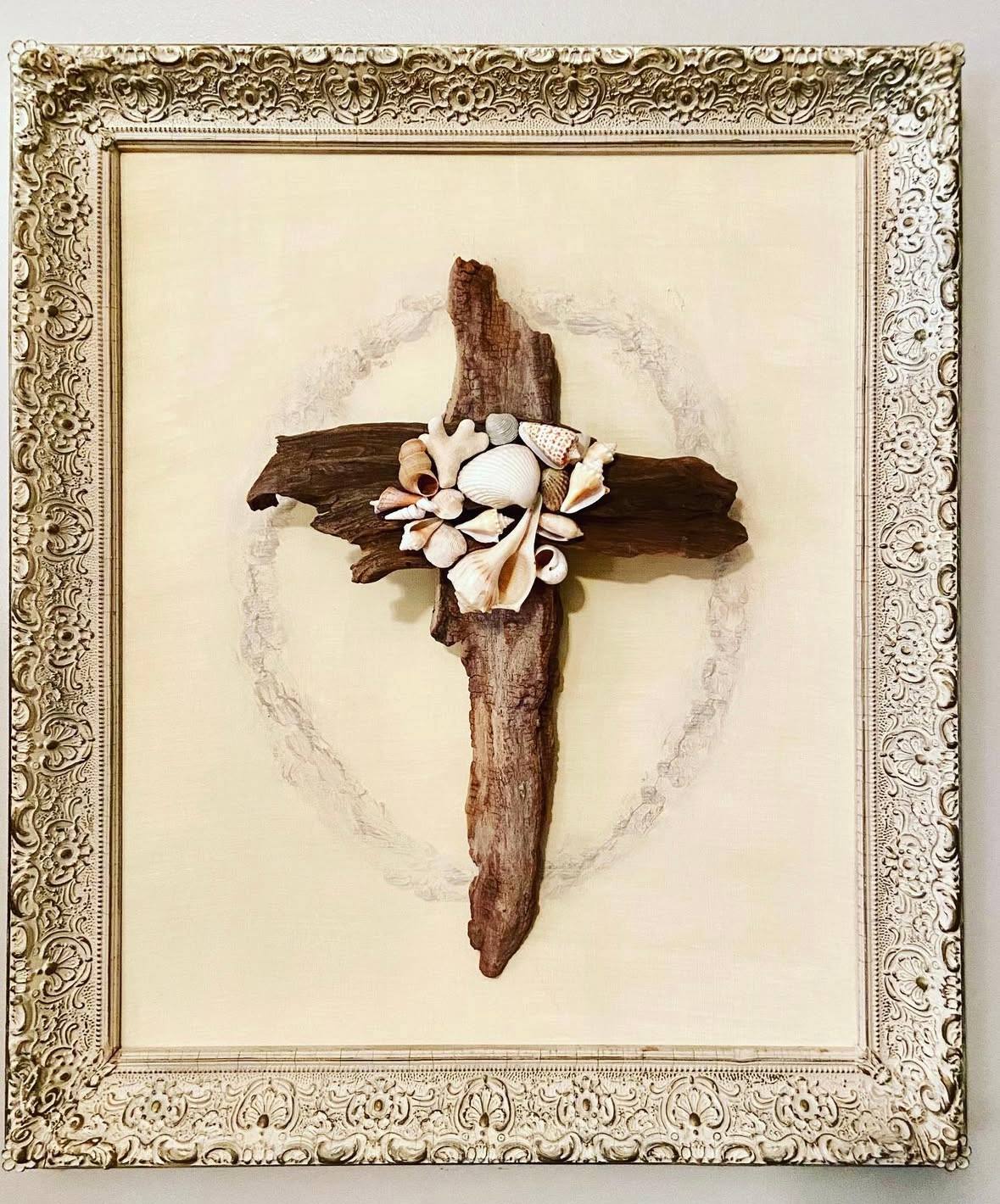 A piece of wood with a driftwood cross and seashells adhered to it in a vintage frame and a circle of brushed acrylic paint surrounding it.