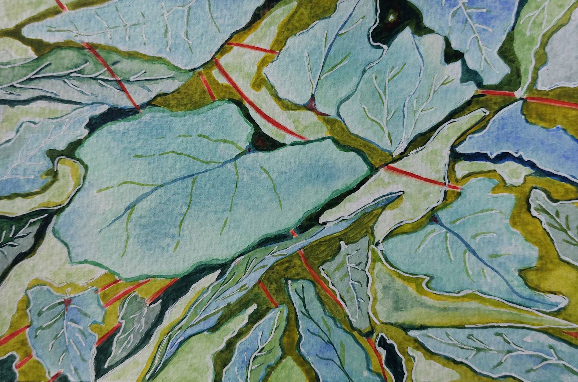 Watercolour of blue green leaves in Summer garden. Supplied in white Trescol tray frame.