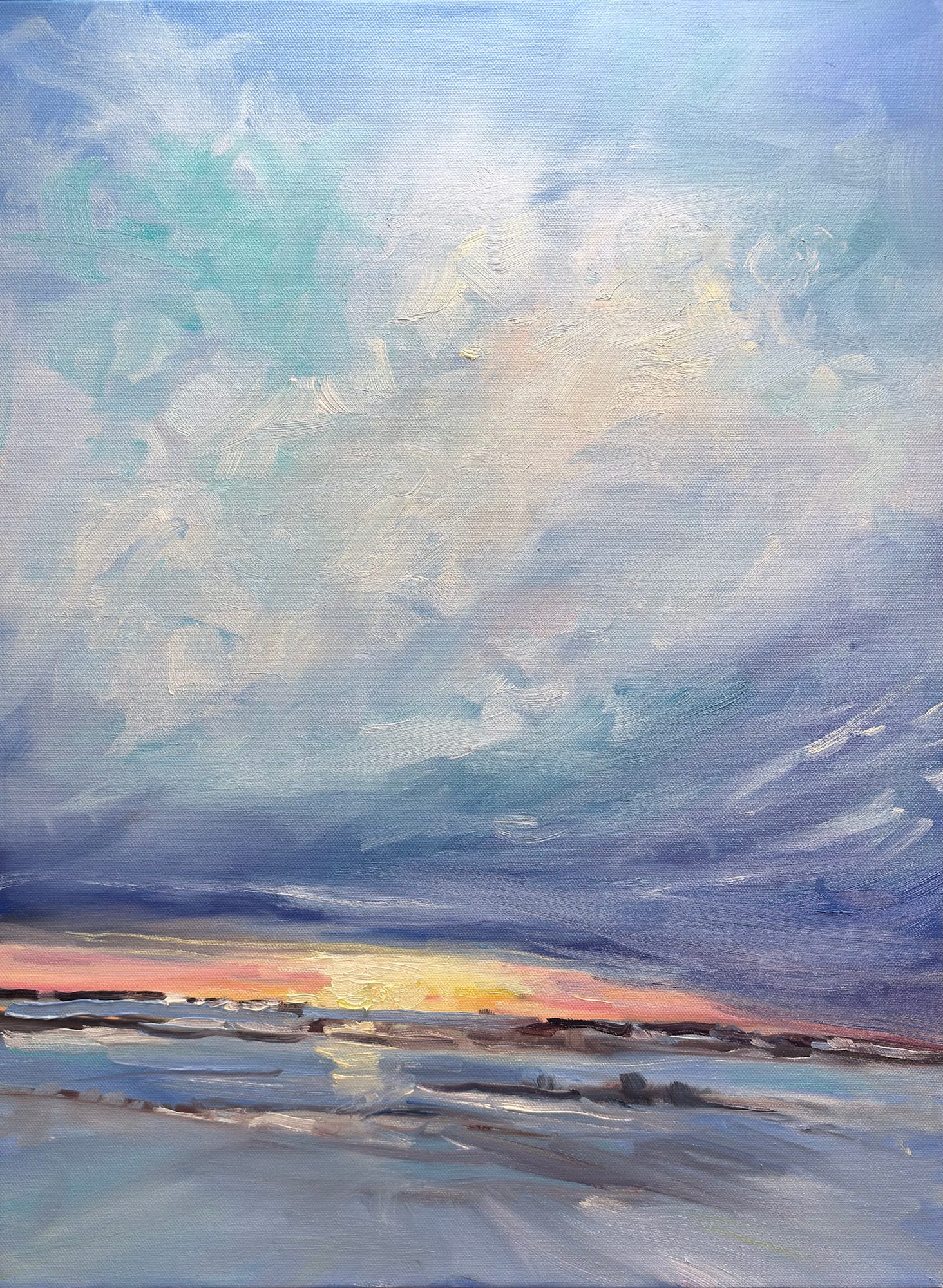 I'm excited to introduce my latest painting, "Sunlit Snow on a Quiet Expanse." This 18x24 oil piece captures the serene beauty of a snowy prairie at sunset. The sky is alive with swirling clouds in hues of blue, pink, and yellow, while the snow below mirrors these colors, creating a harmonious reflection. This peaceful landscape was inspired by the winter season and the open, quiet prairies. What made creating this artwork unique was the exploration of light and color to convey a calming atmosphere. I hope it brings a sense of tranquility and warmth to your space.
