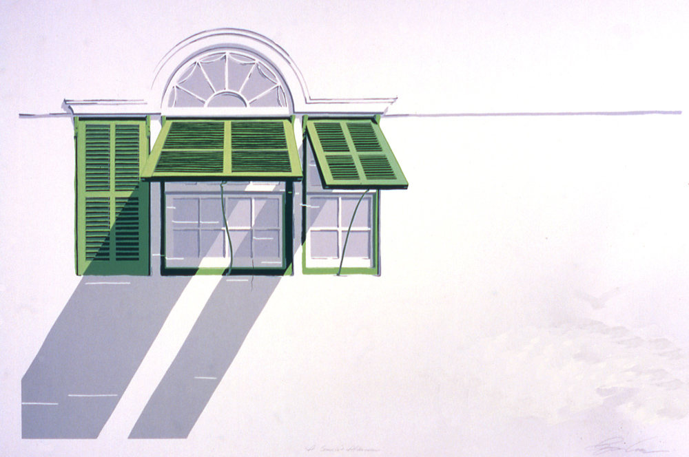 The original print, “A Somerset Afternoon” was conceived as a distillation of the winter sunlight on this classic Bermuda House. It was the rectory home for many years. The long shadows speak of the winter sun. I would see this image from my seat on the bus while at residency in the early days of the Arts Centre at Dockyard, Somerset Bermuda…