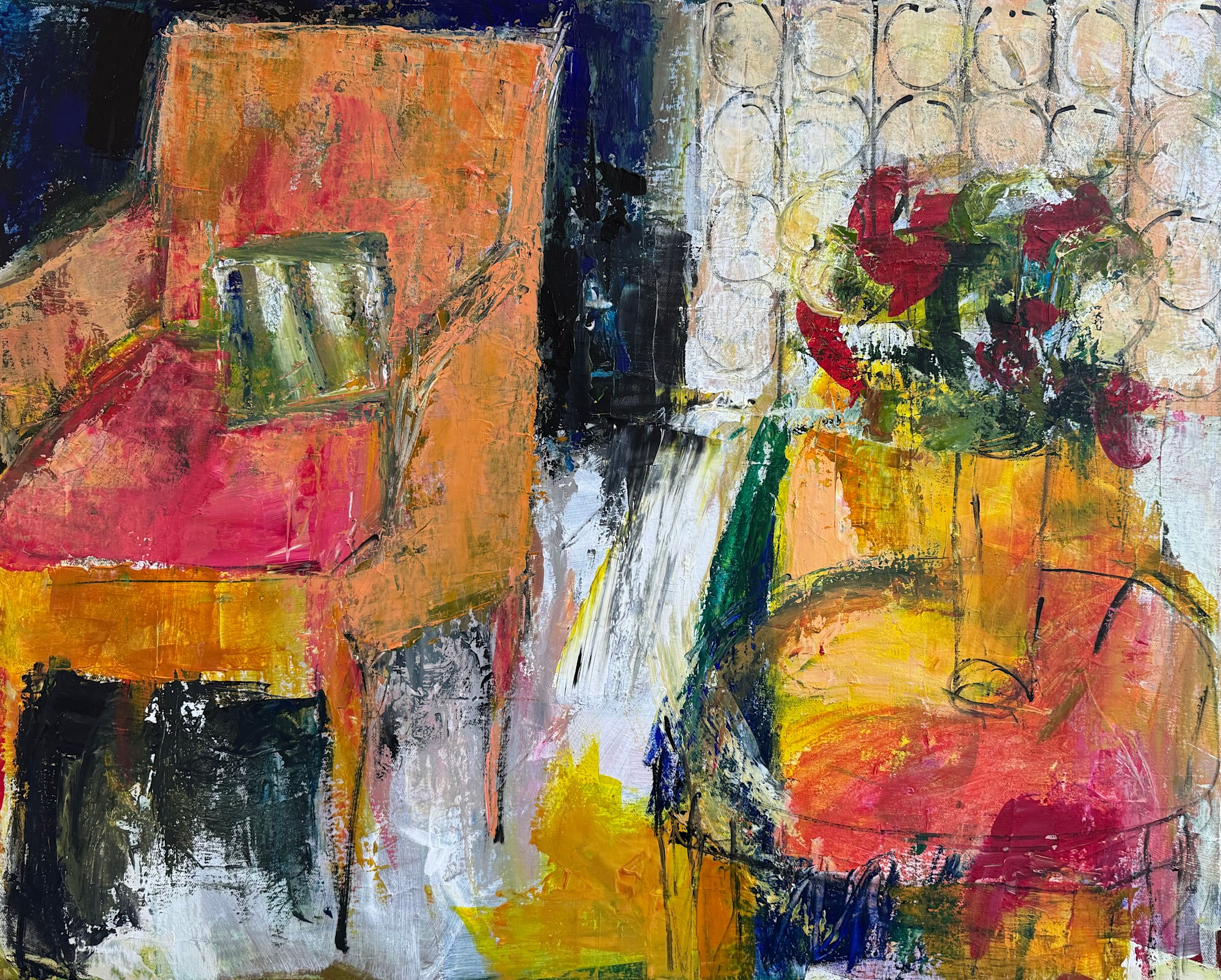 Acrylic painter of large abstracted domestic interiors and figures rendered in bold colors and layered textures.