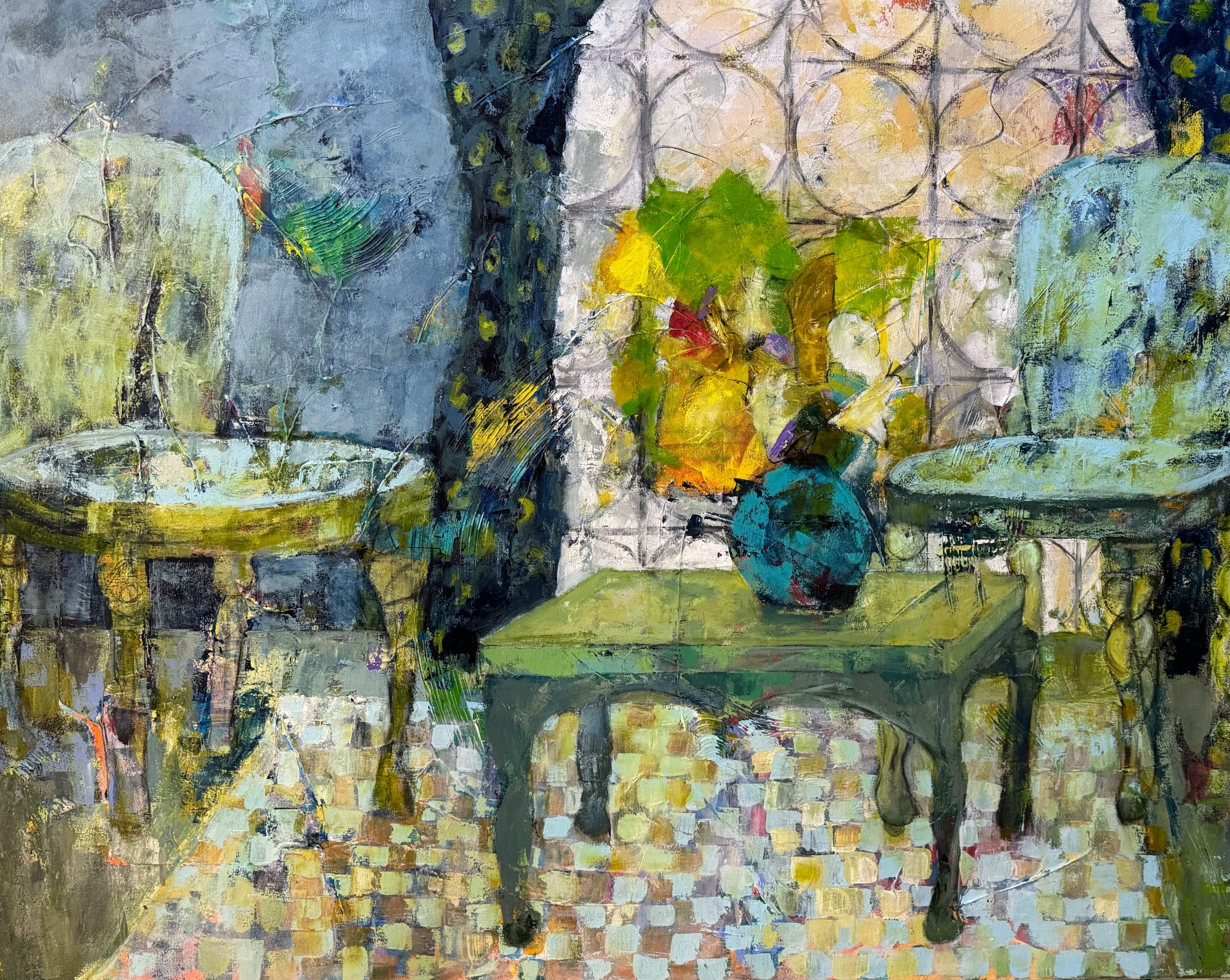 Acrylic painter of large abstracted domestic interiors and figures rendered in bold colors and layered textures.