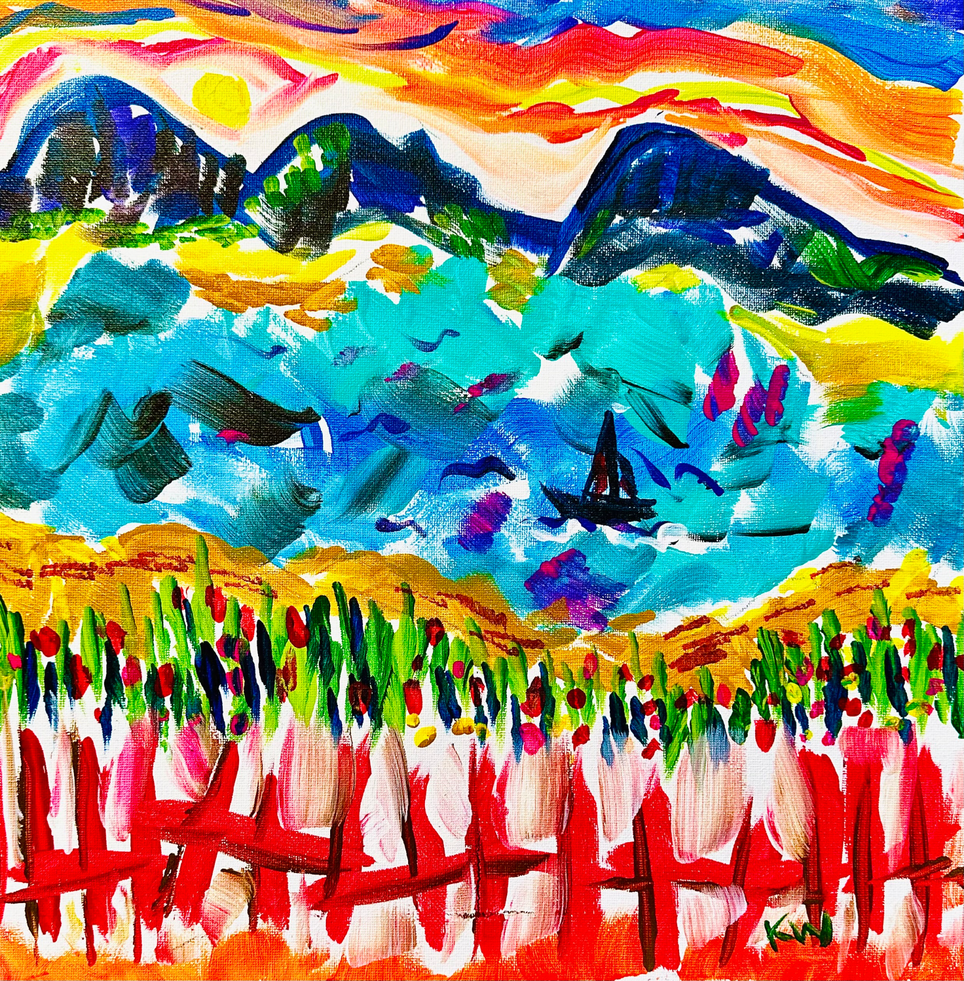 Purple mountain shadows contrast with the bright neon light show off a streaming, silent sunset as we sail across the deepening colors of undulating waves.