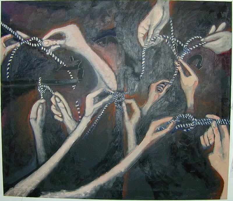 large oil painting, expressive hands tying knots. imagery used on album art for The Phantom Limbs "Displacement" album on Alternative Tentacles records