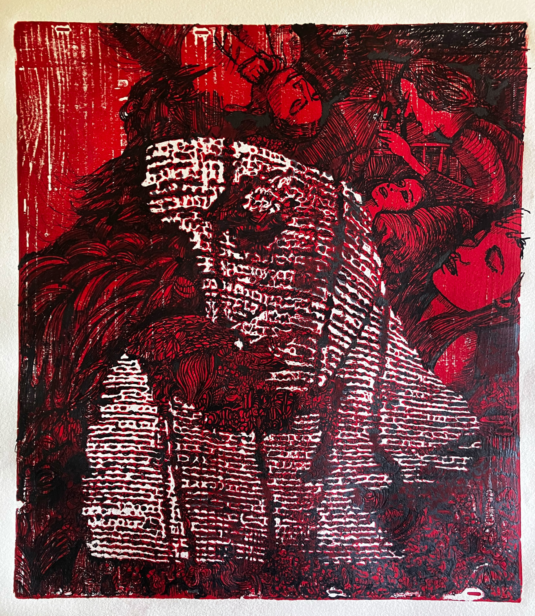 woodcut was pulled from wine crate assemblage sculpture "Die Kunstkammer"