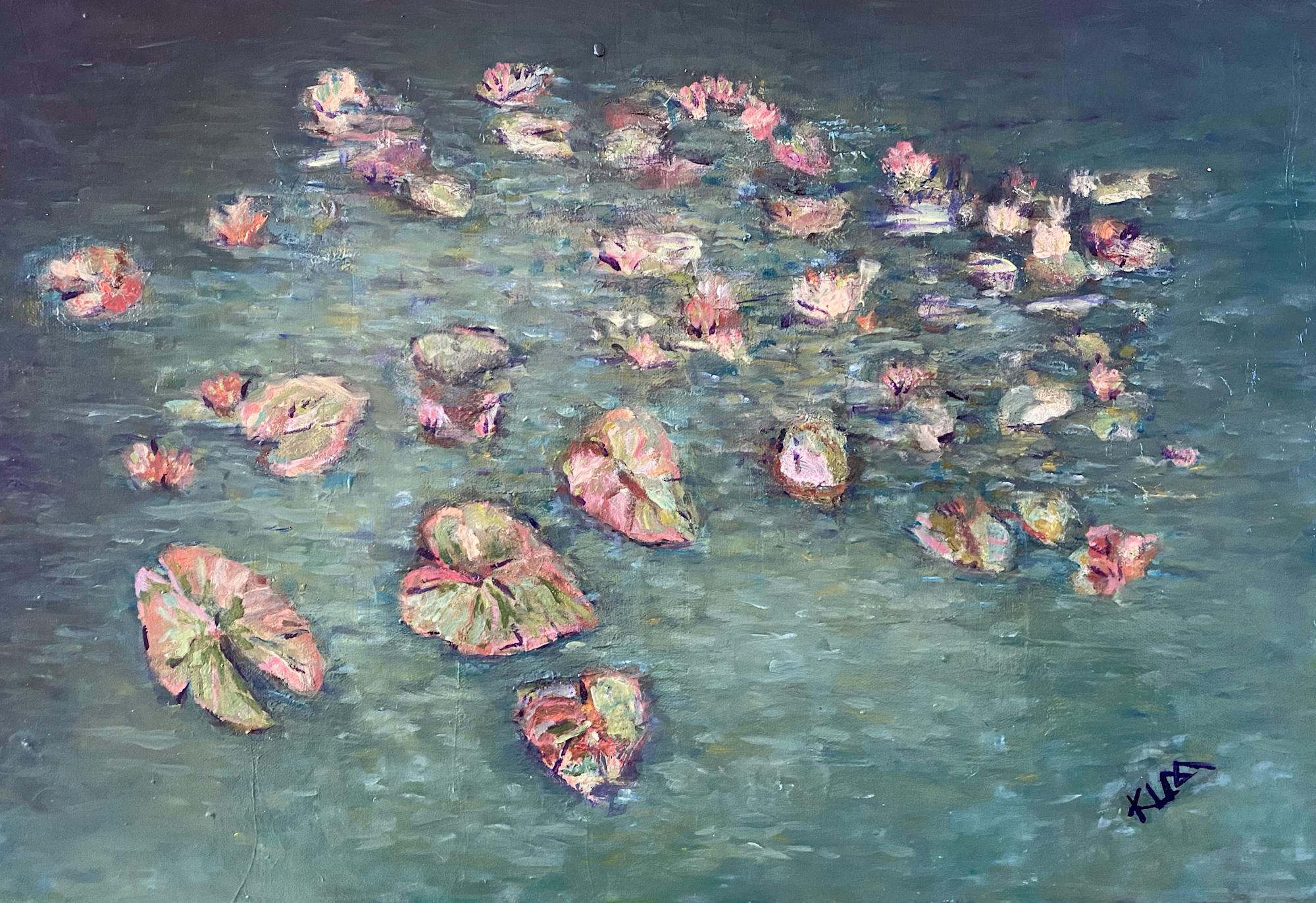 A romantic waterscape in soft greens and pinks- ideal position for bedroom, dressing room or spa.