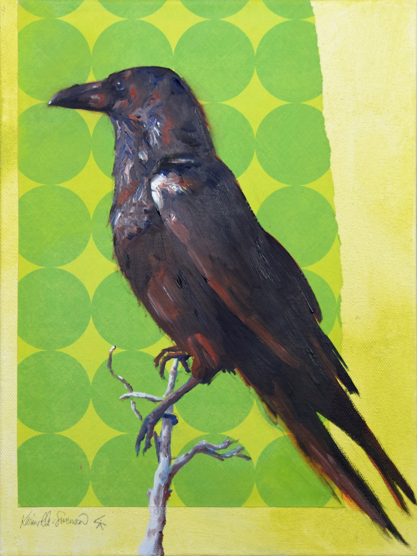 Collage and acrylic background with a raven painted in oil. Painted on a gallery wrapped canvas.