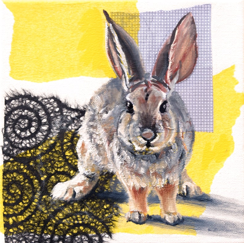 Cottontail rabbit head on. Yellow and black collage background.