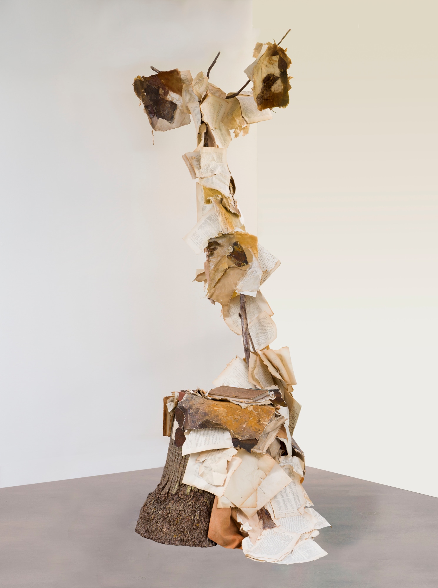 The trunk of a tree, fabric, book pages, handmade paper, branch