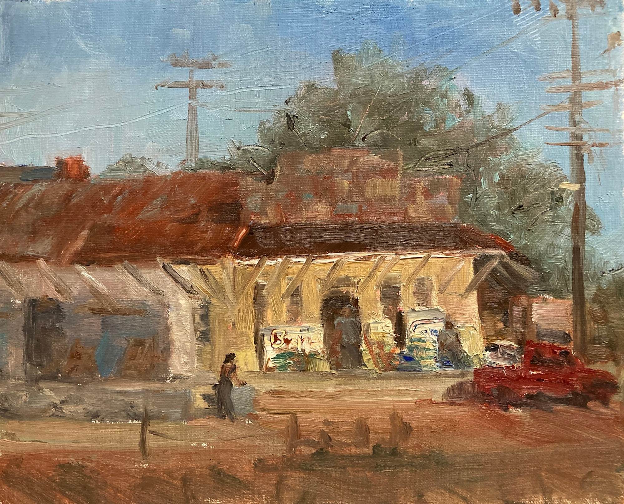 Saturday morning at the feed store, downtown Corsicana. I think I like to paint where I can hear the trains go by!