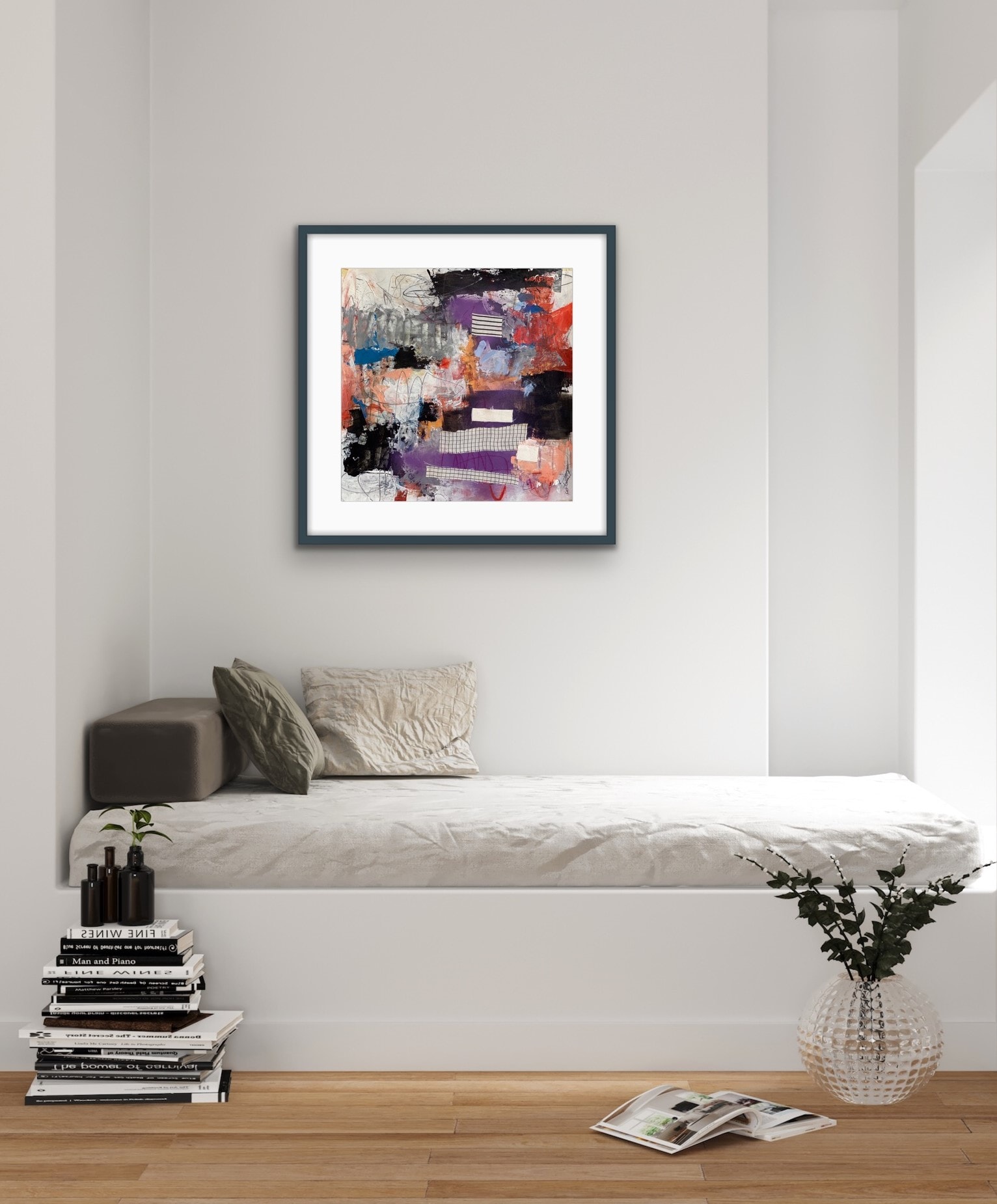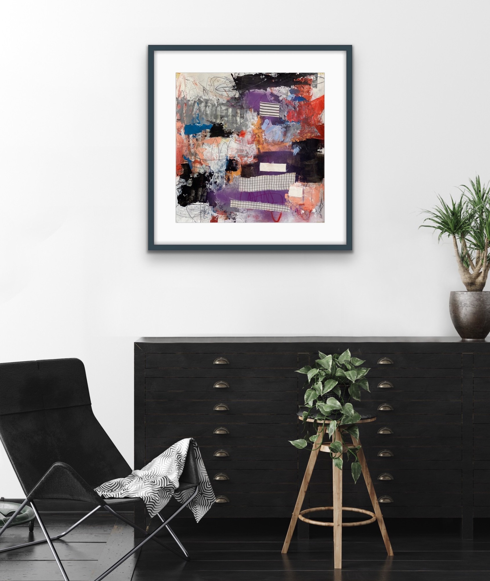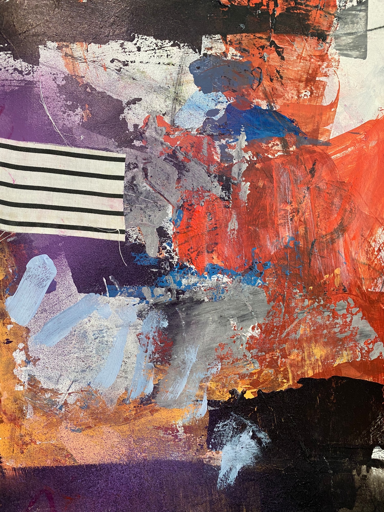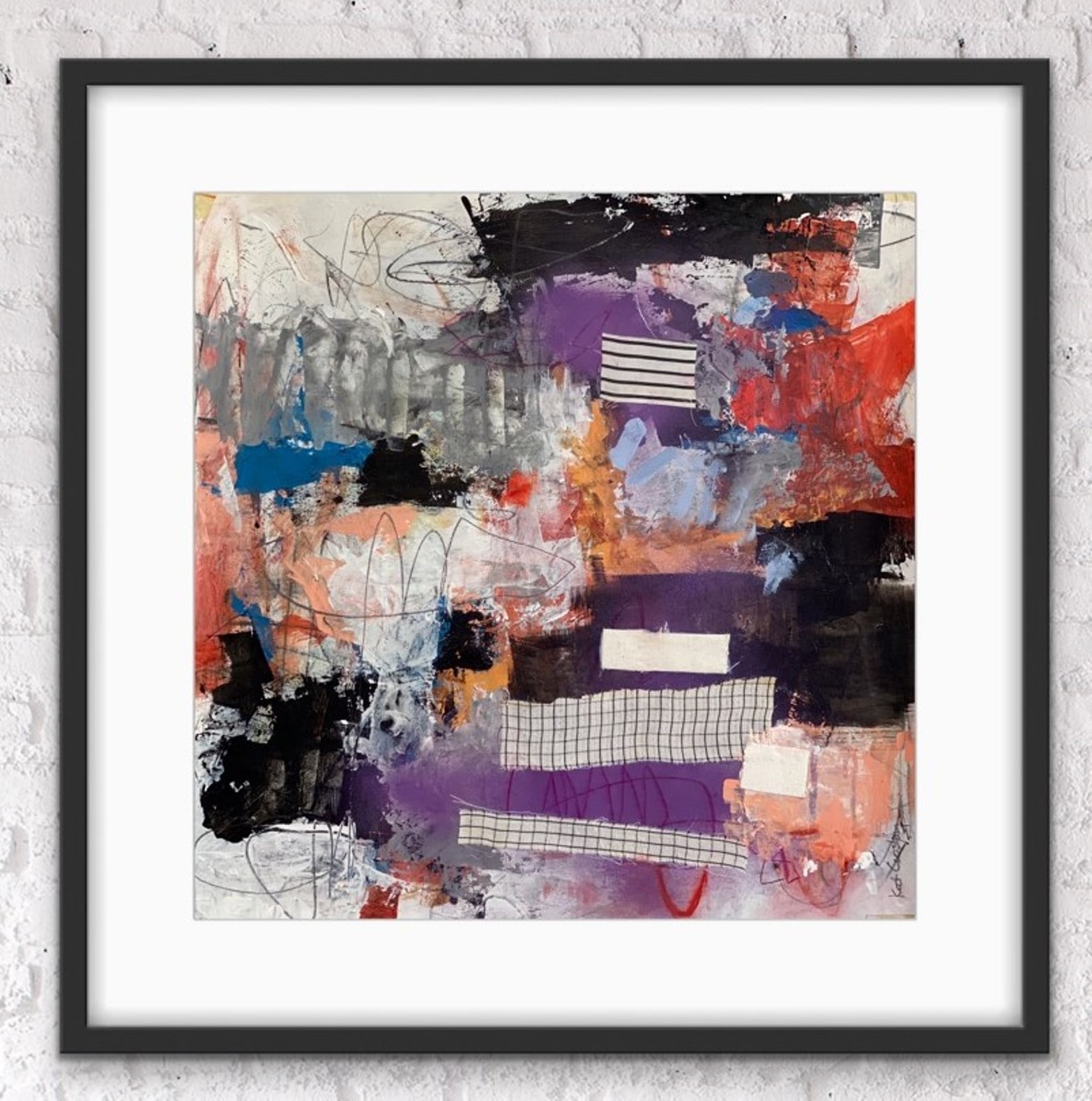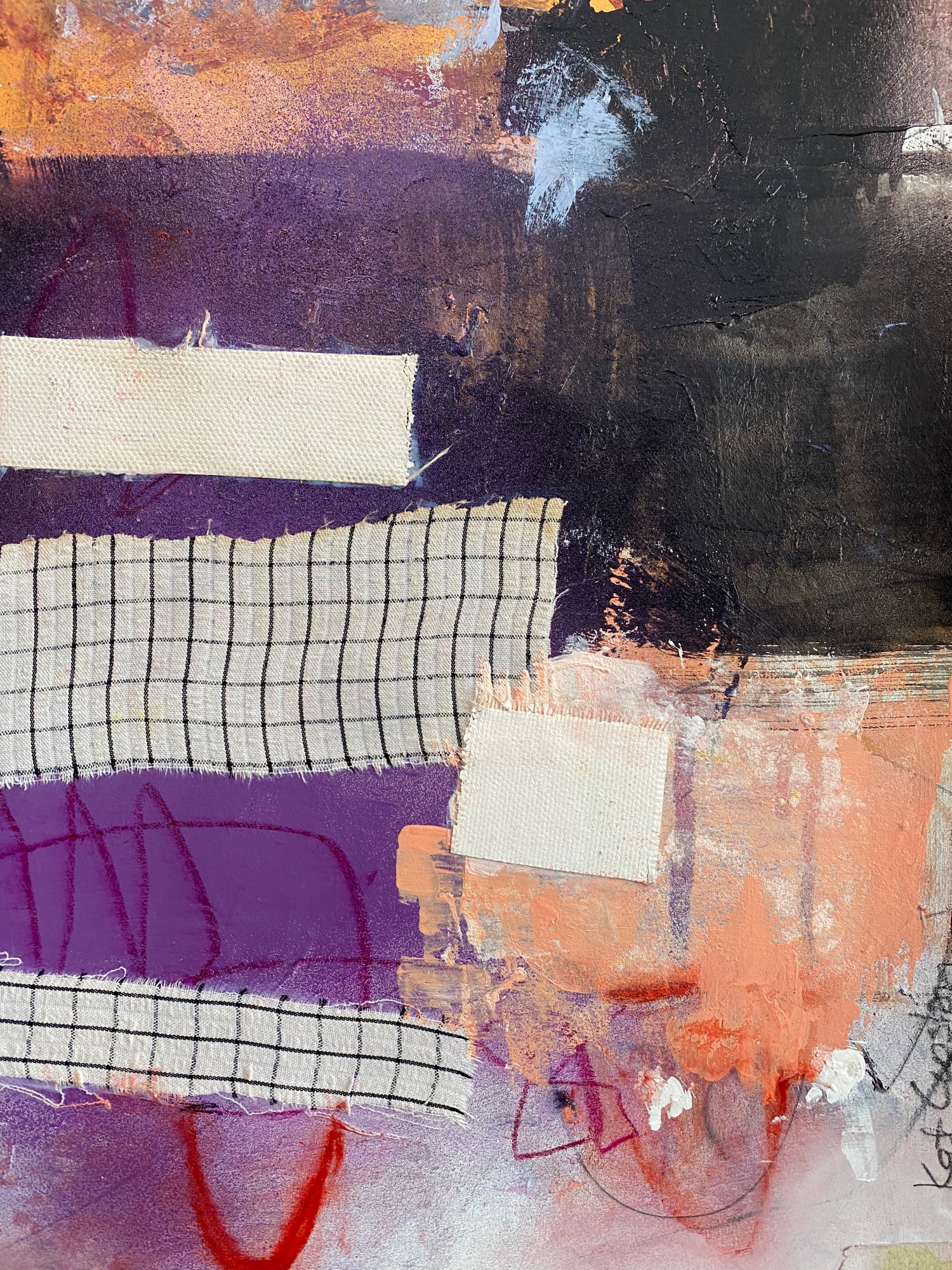 Bold and energetic abstract done in mostly shades of black and white with touches of violet, peach and pink. It was done on heavy paper with acrylic, pencil, crayon, and applied fabric. It has layers upon layers of expressive mark making which gives it depth and texture. It is shown framed but will come unframed to be framed by the buyer in their choice of frame.
