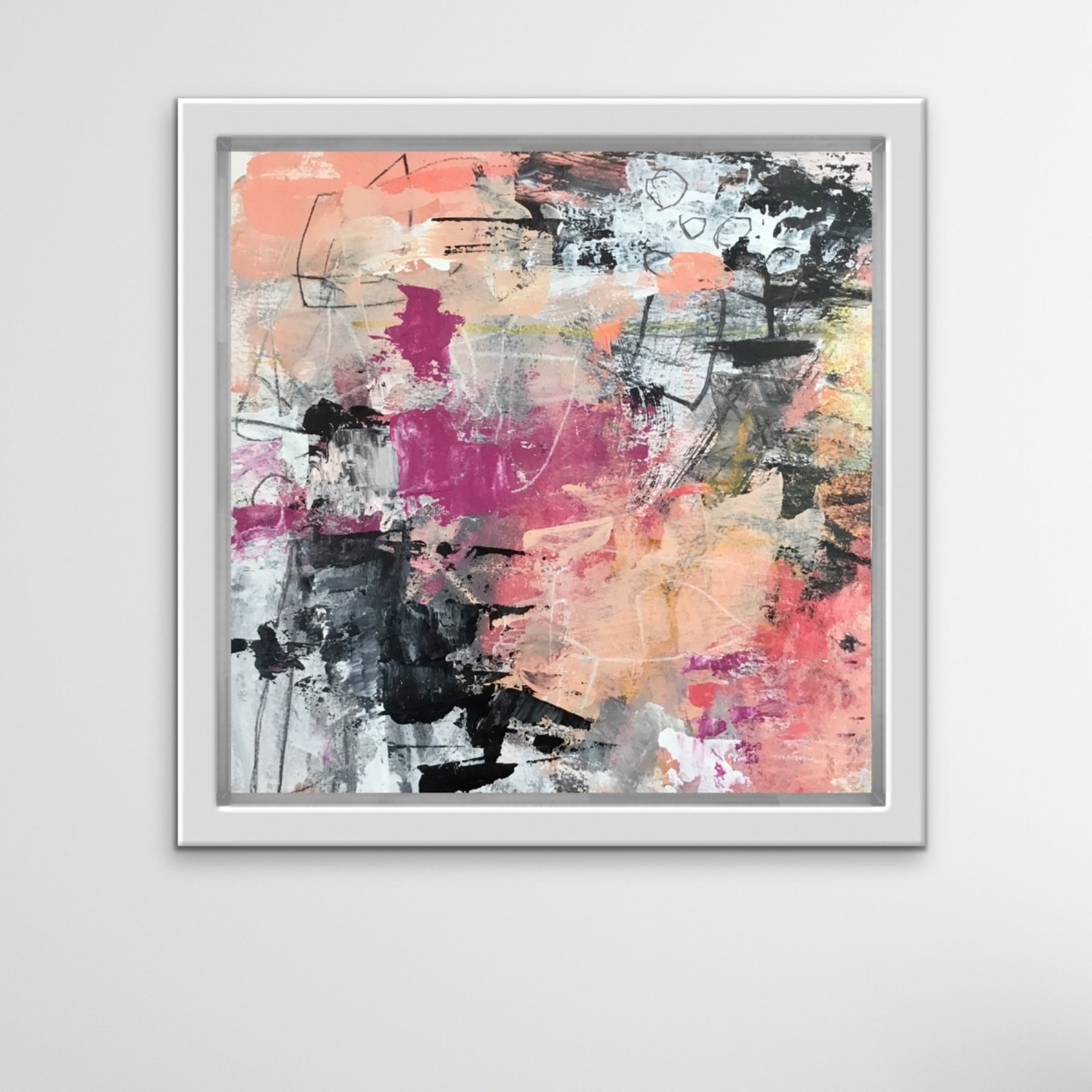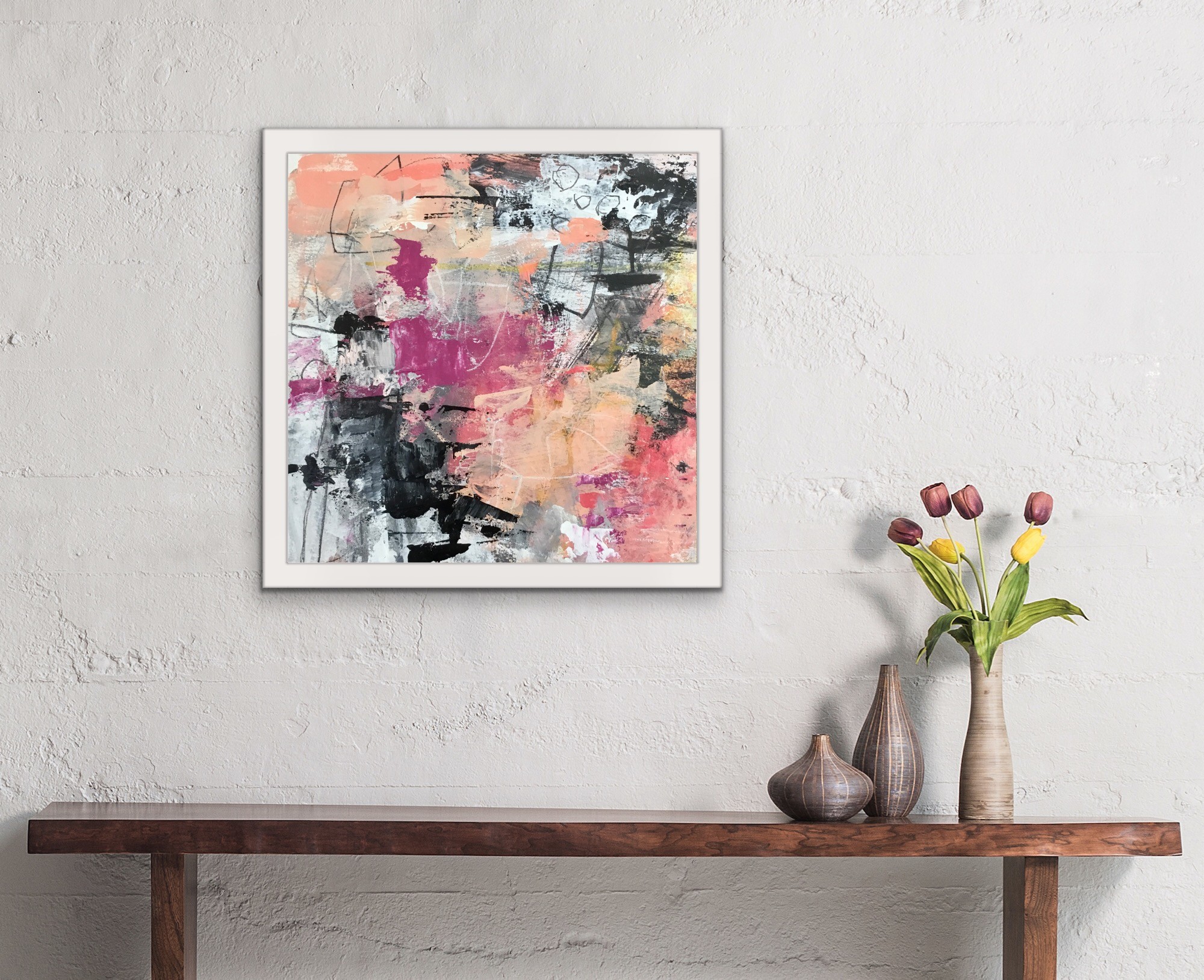 Bold and unique abstract in shades of black, white, peach, pink and yellow. It was done with acrylic and mixed media on heavy paper then applied to a wood panel.