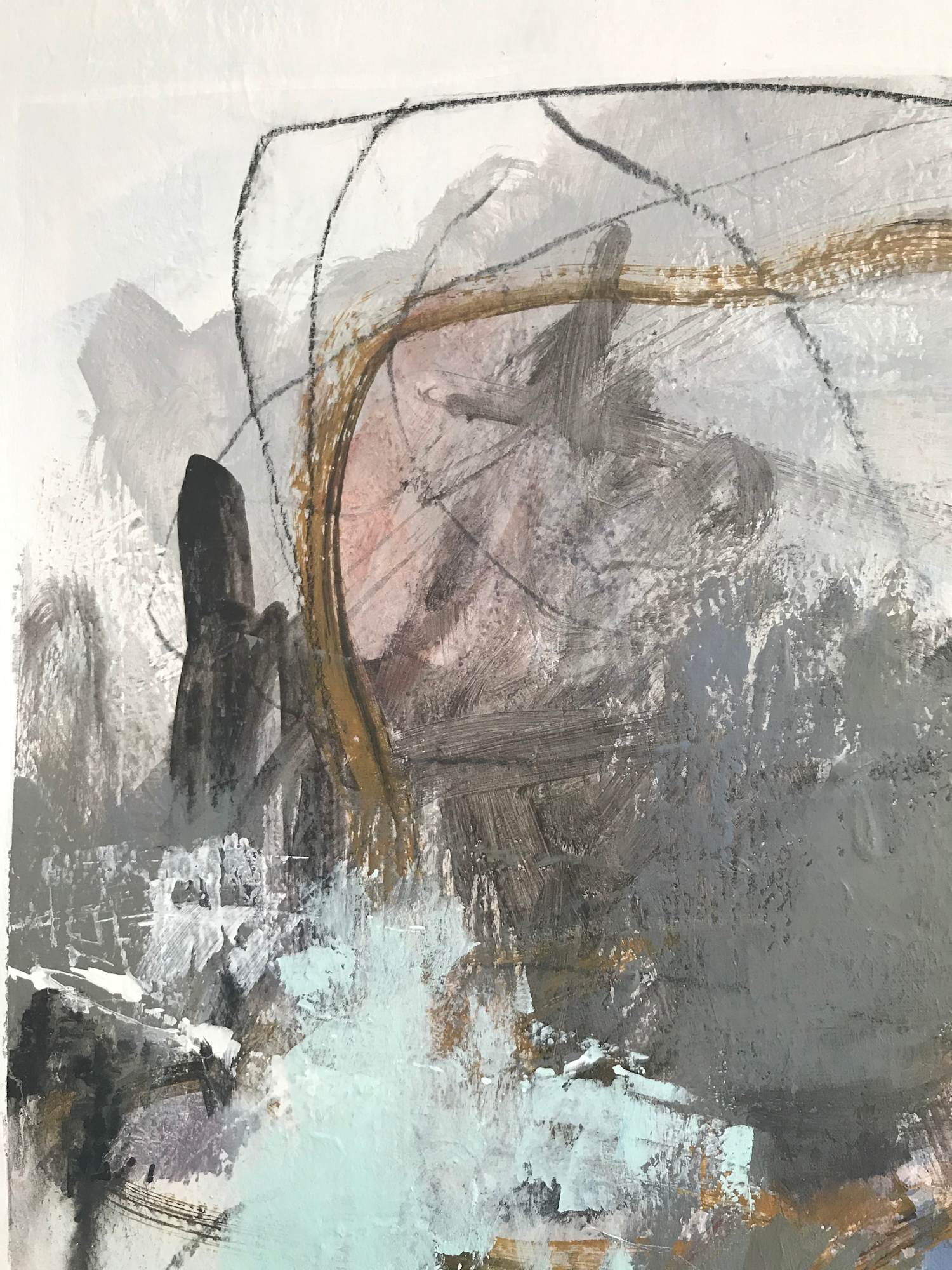Bold yet dreamy abstract expressionism done with acrylic paint and mixed media (pencil, charcoal, marker) on heavy watercolor paper. It has a 1" off white border around the edge where the signature resides. It is sealed with acrylic glazing medium with a satin finish. The piece will be shipped rolled in a tube.