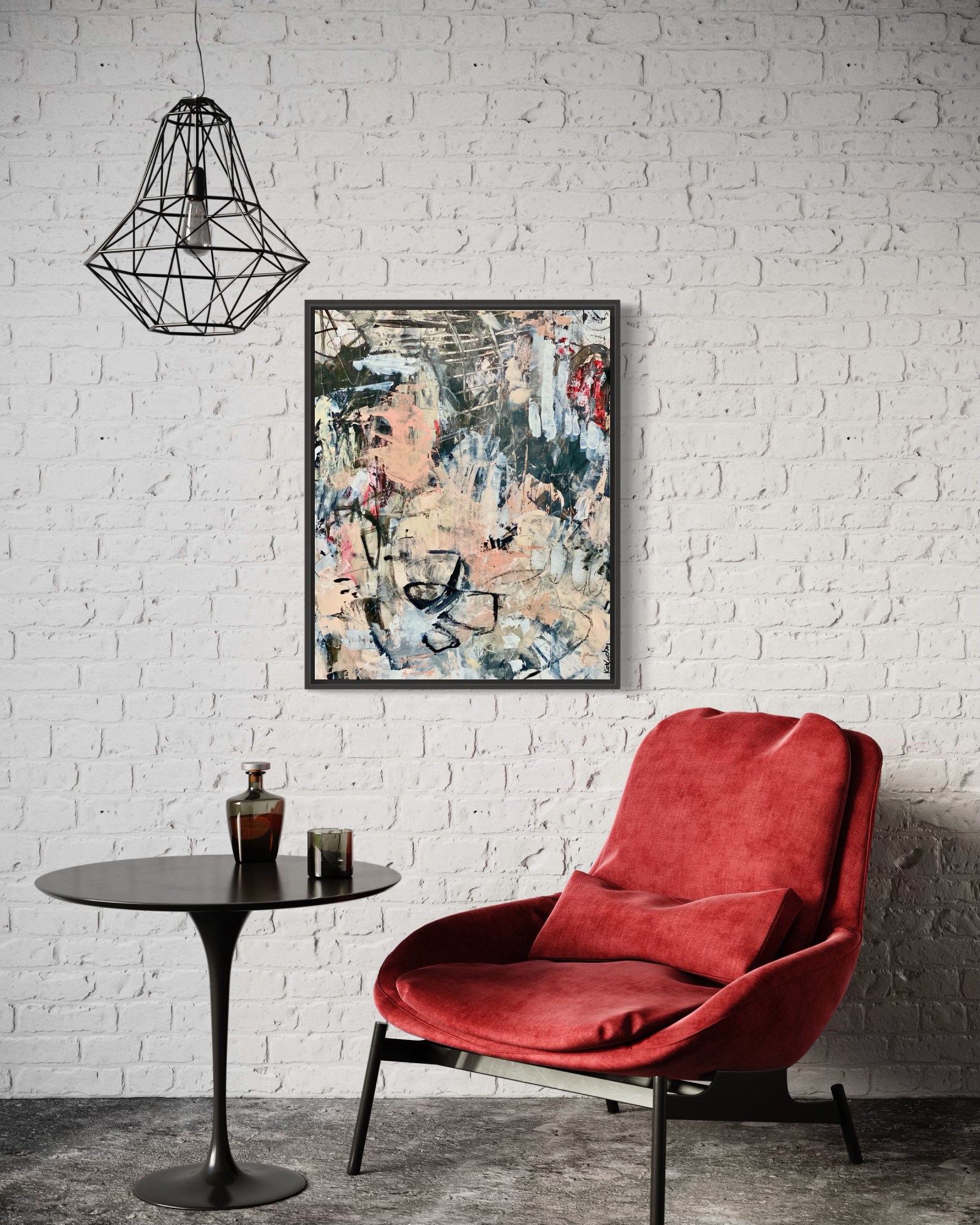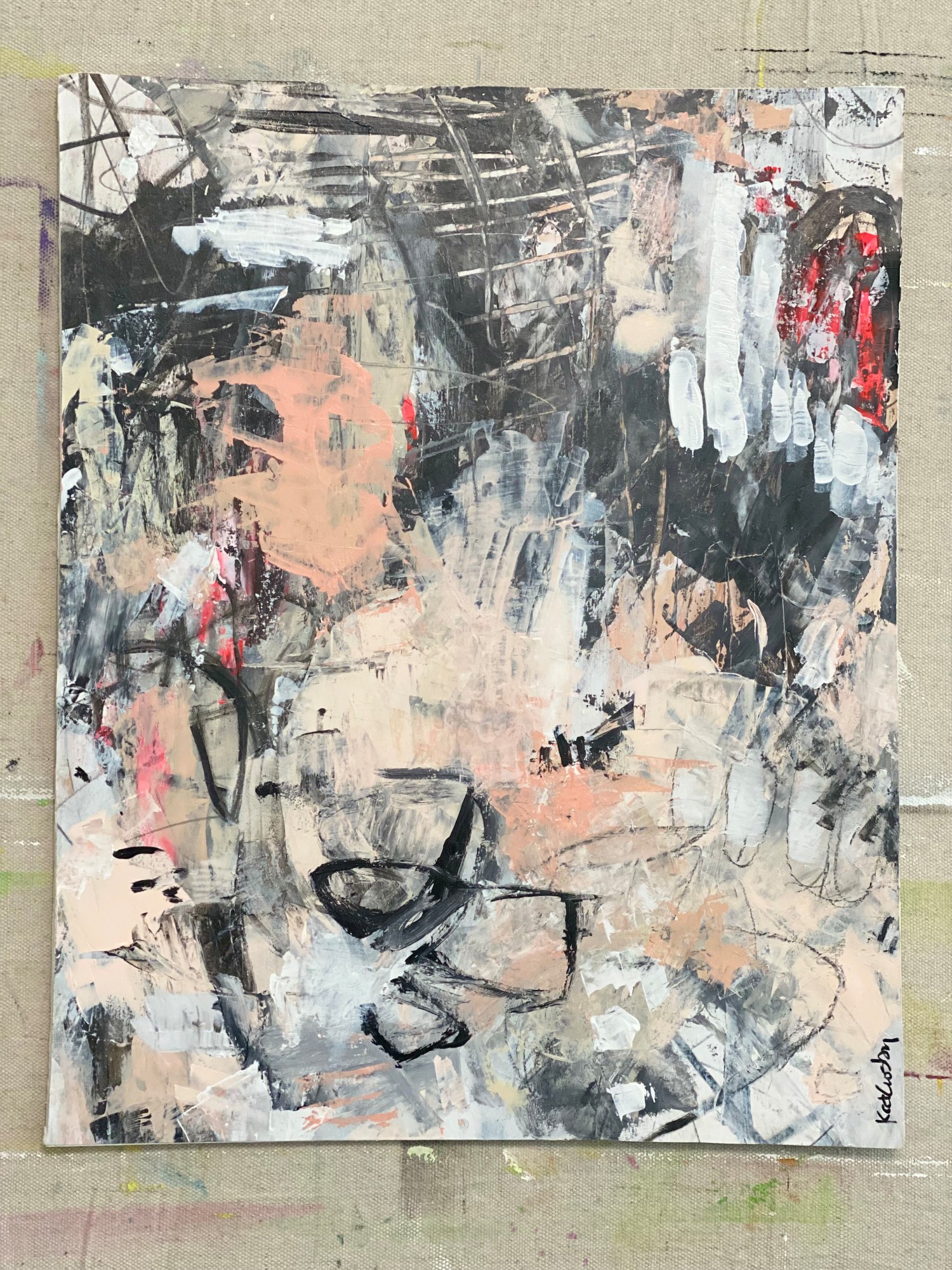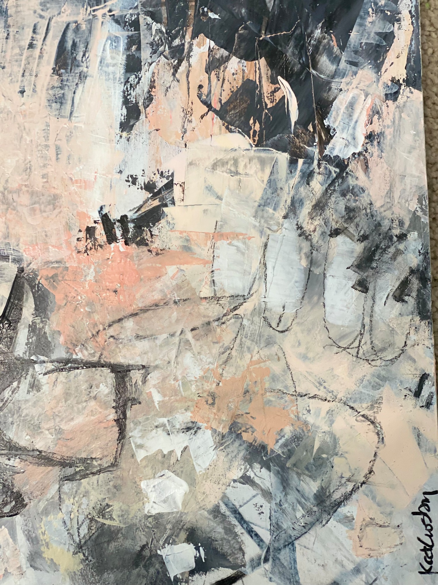 Bold and energetic abstract done in mostly shades of black and white with touches of peach and pink. It was done on paper then applied to a foam board. It has layers upon layers of expressive mark making which gives it depth and texture. It is shown framed but will come unframed to be framed by the buyer in their choice of frame.