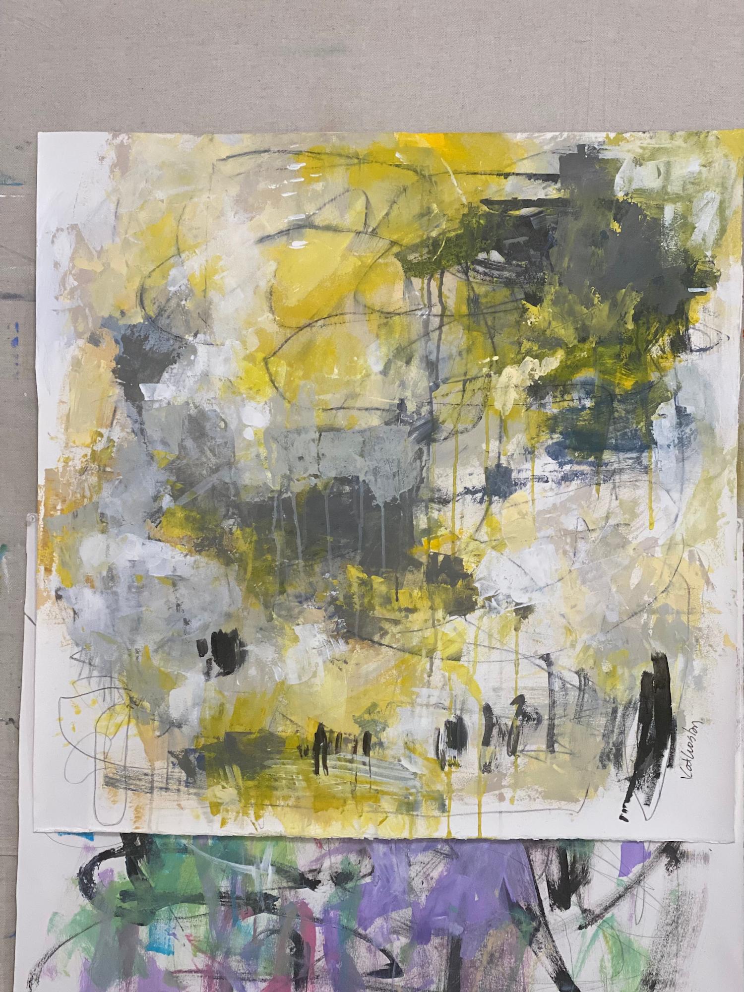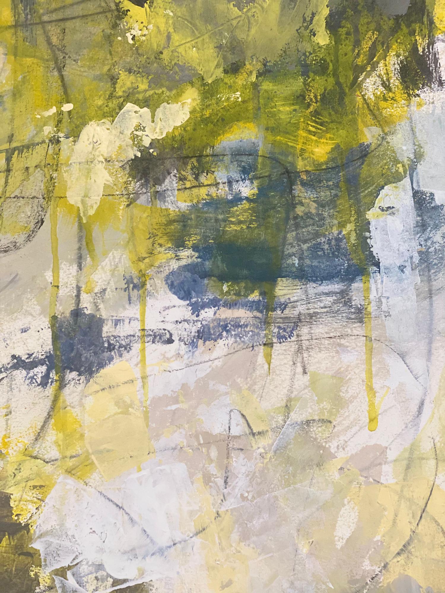 Bold and energetic abstract expressionism done with acrylic paint and mixed media (pencil, charcoal, marker) on heavy watercolor paper. It is sealed with acrylic glazing medium with a satin finish. It can be cold pressed onto a hard surface to be framed without glass or matted and framed with glass. The piece will be shipped rolled in a tube.