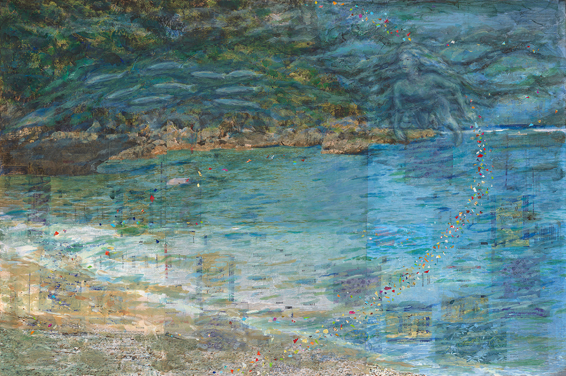 This goddess is drawn and her environment is based on my own photography on tissue, layered over candy wrappers, creating the base of the image and providing shine and sparkle, but also highlighting the trash in our natural areas. The image in the photograph was tiled on nine sheets so covers the whole image which I painted to add depth and to emphasize the goddess. She also has added lines power in more bits of candy wrappers.