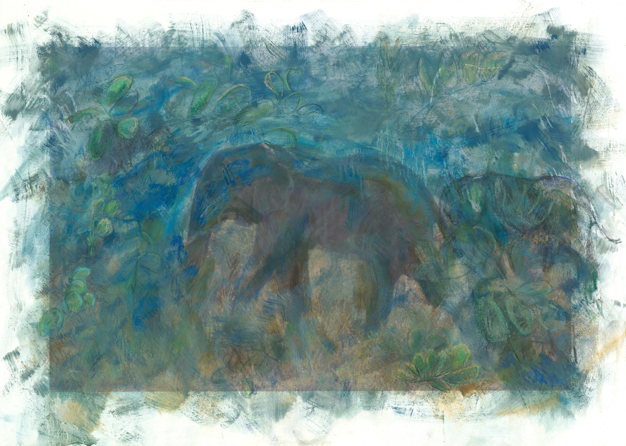 Incorporating one of my photos, this is a portrait of the leader of the elephants in Murchison National Park, Uganda , the strongest in the herd. The elephant’s world includes painted and drawn grasses and acacia trees.
