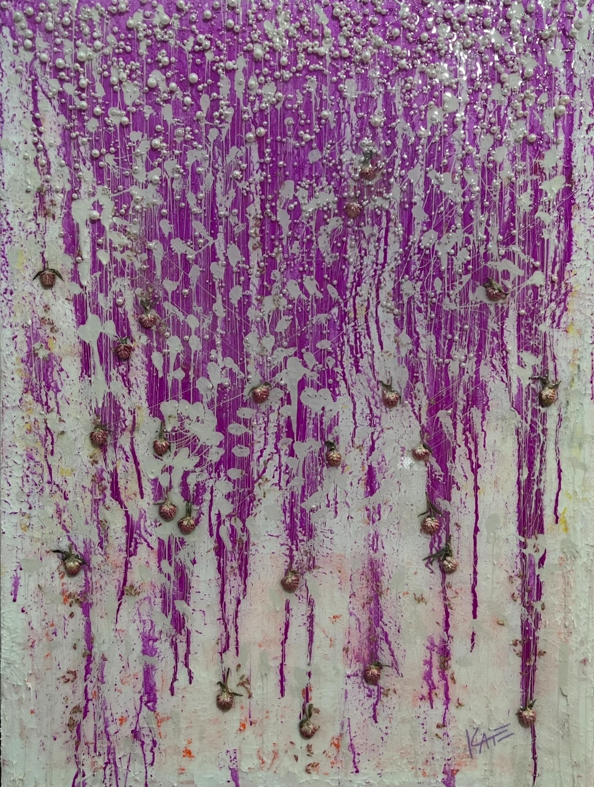Acrylic, Resin, Dried Flowers, Faux Pearls on Canvas