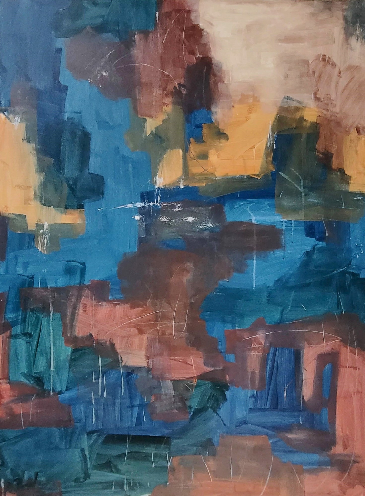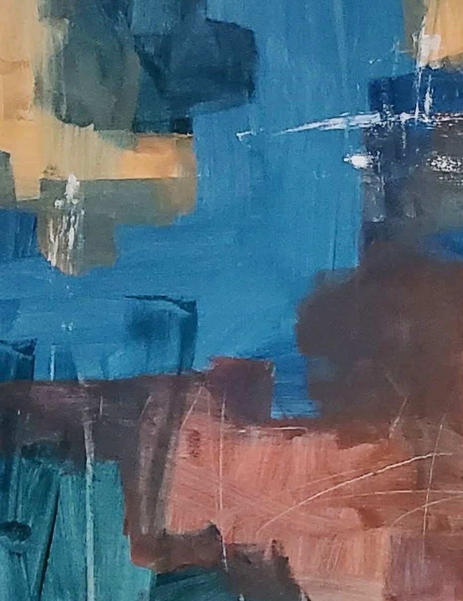 A slightly moody expressionist work representing a possible lake and woods with shadows at dusk and an evening sunset glow.