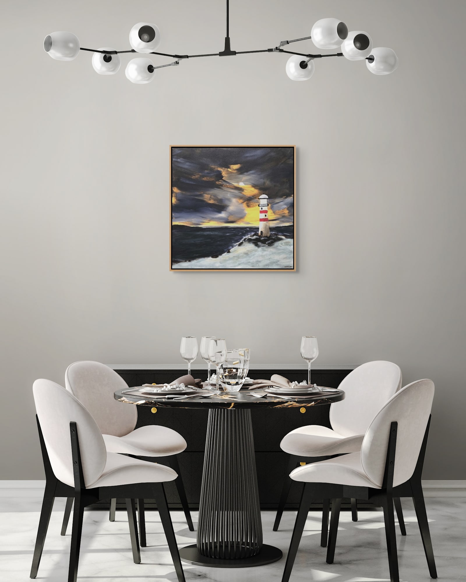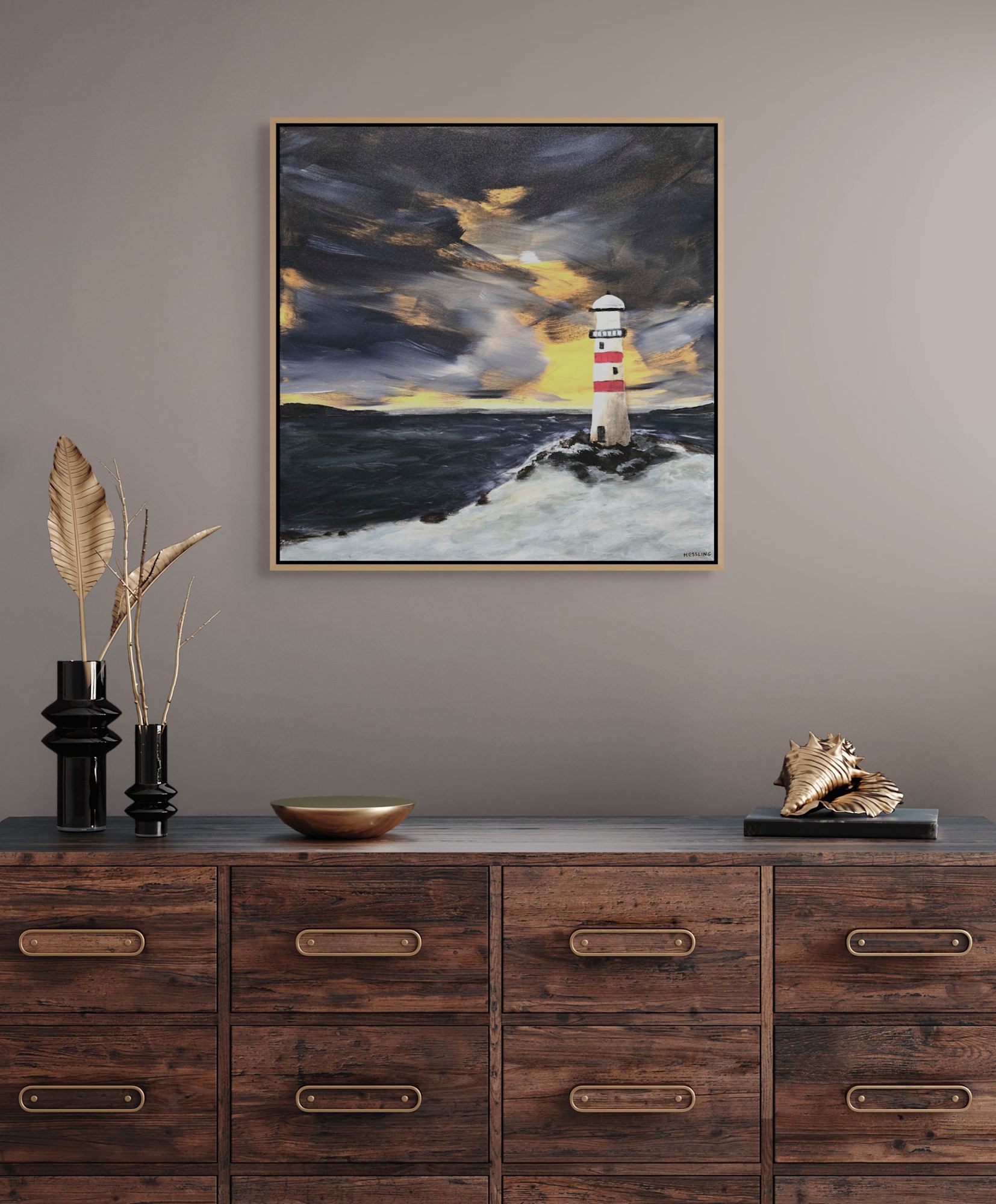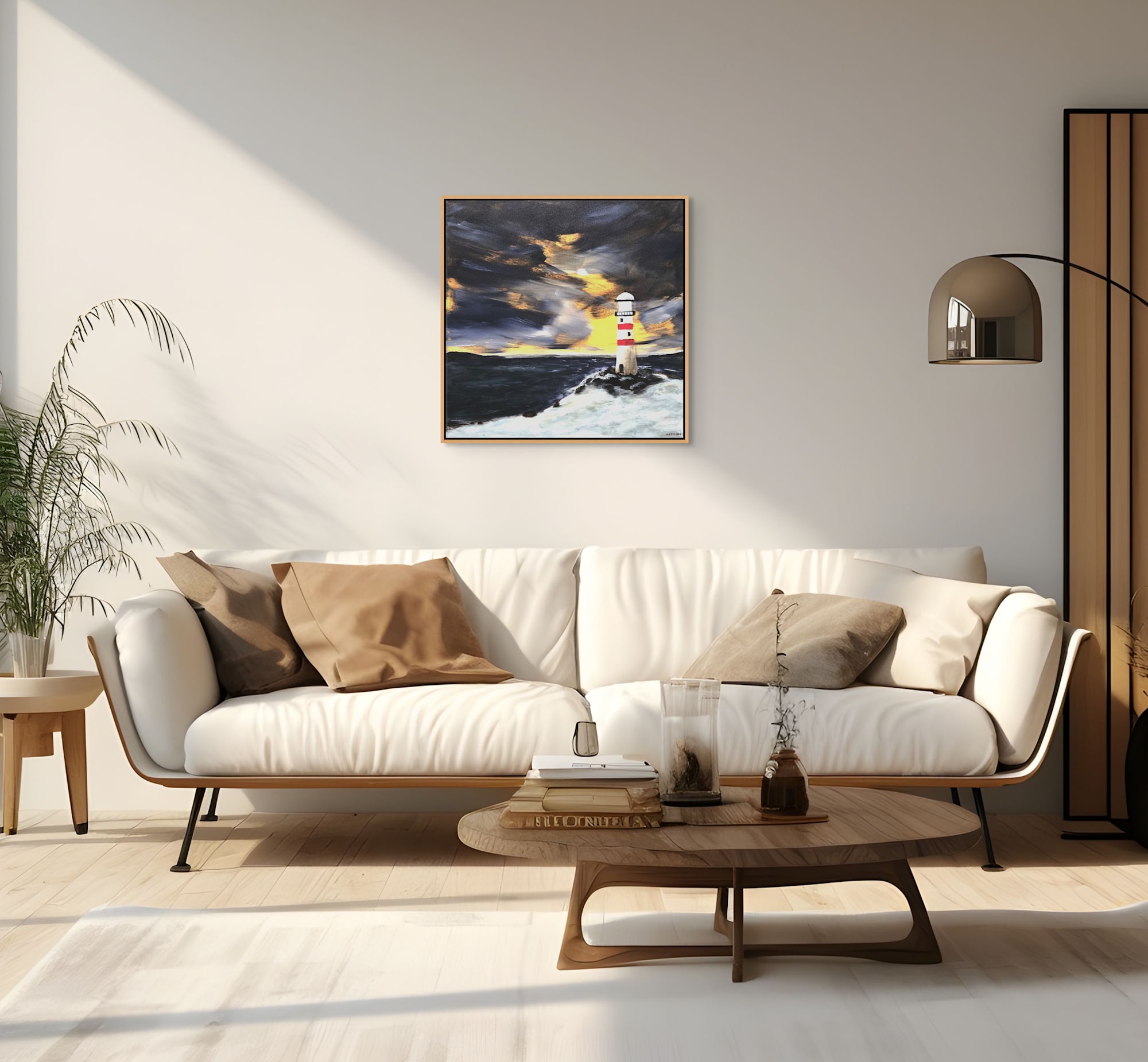 A Lighthouse standing against a dramatic sky and rough sea. The contrast between dark storm clouds and streaks of yellow light creates a sense of tension and atmosphere. I love these colour contrasts.