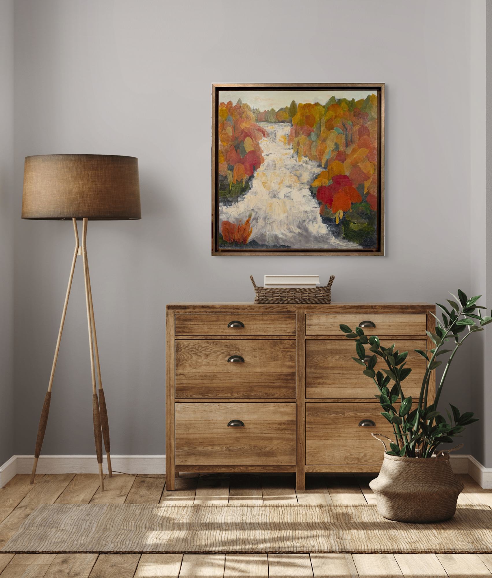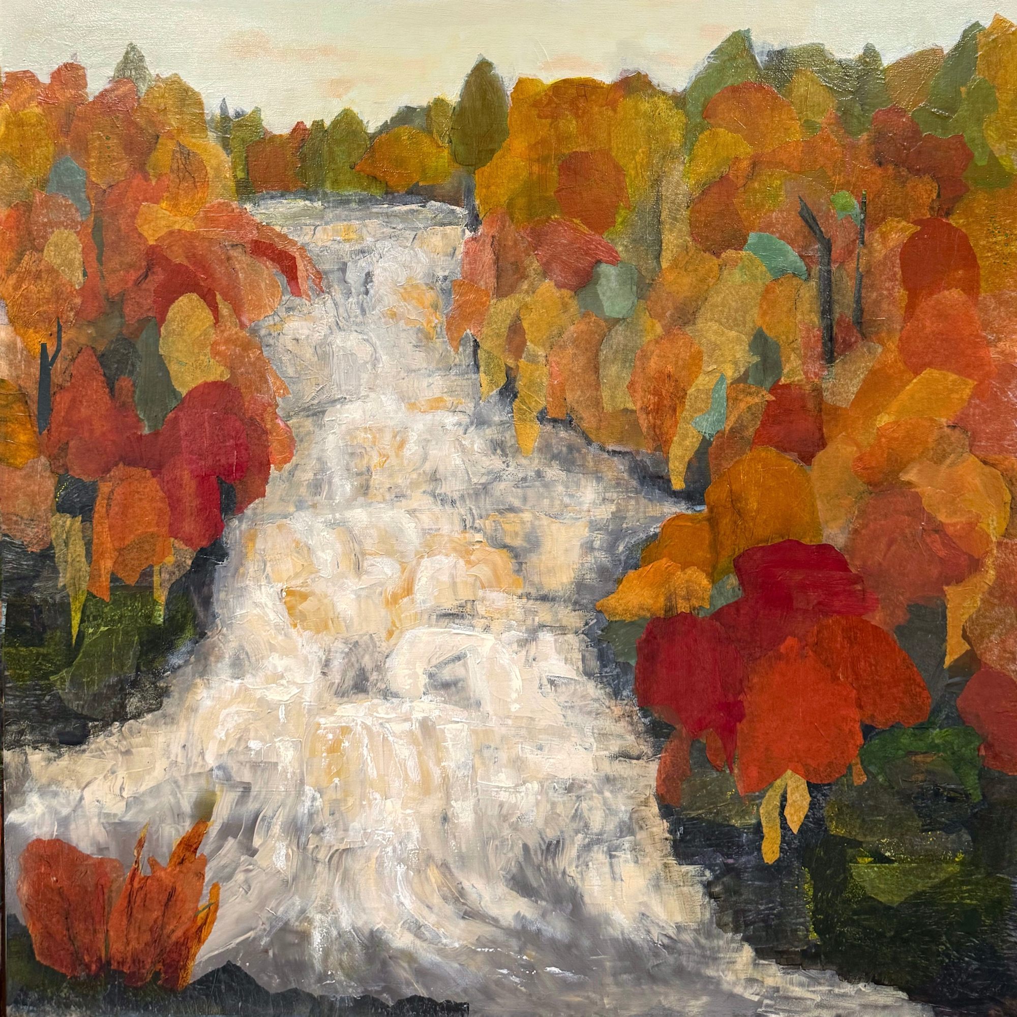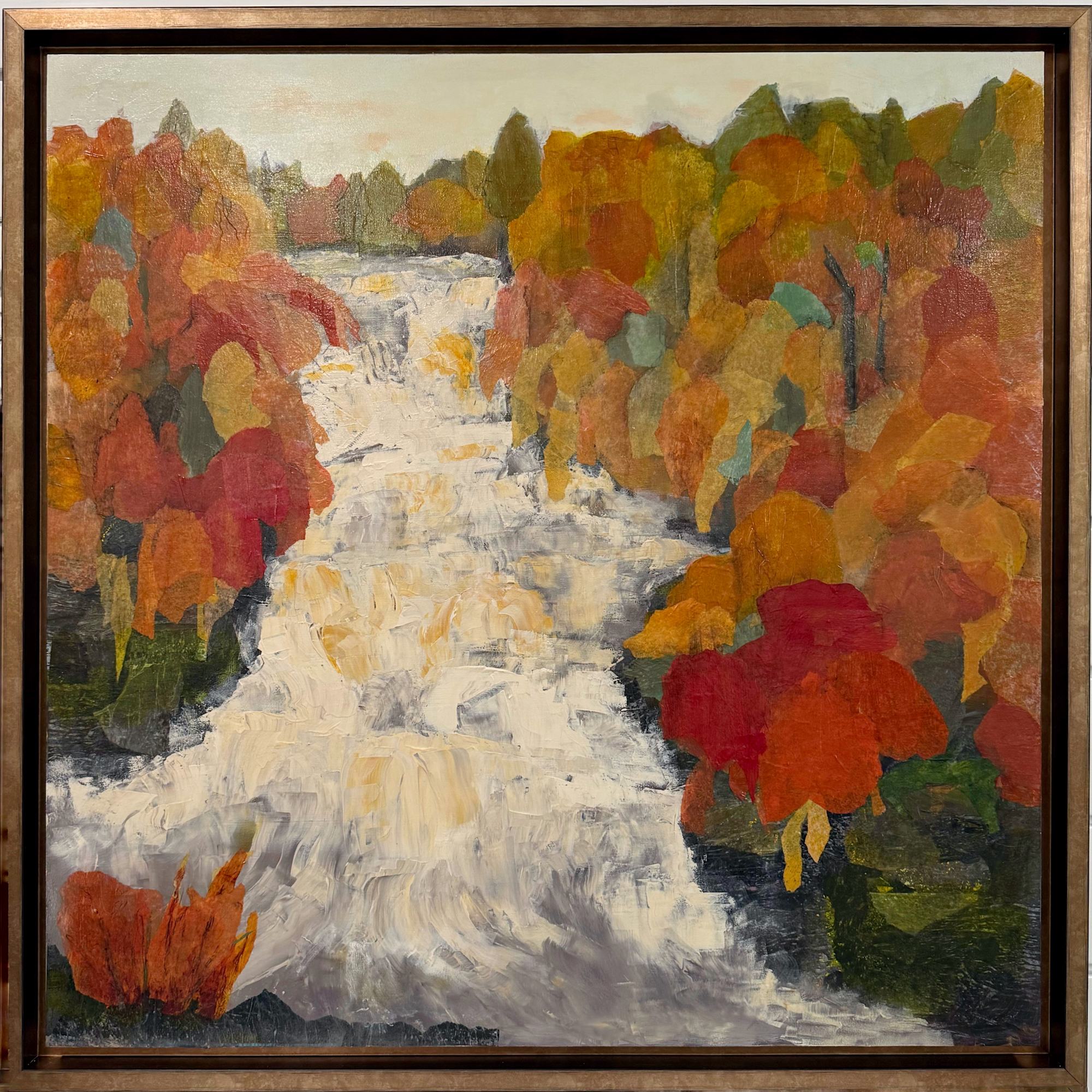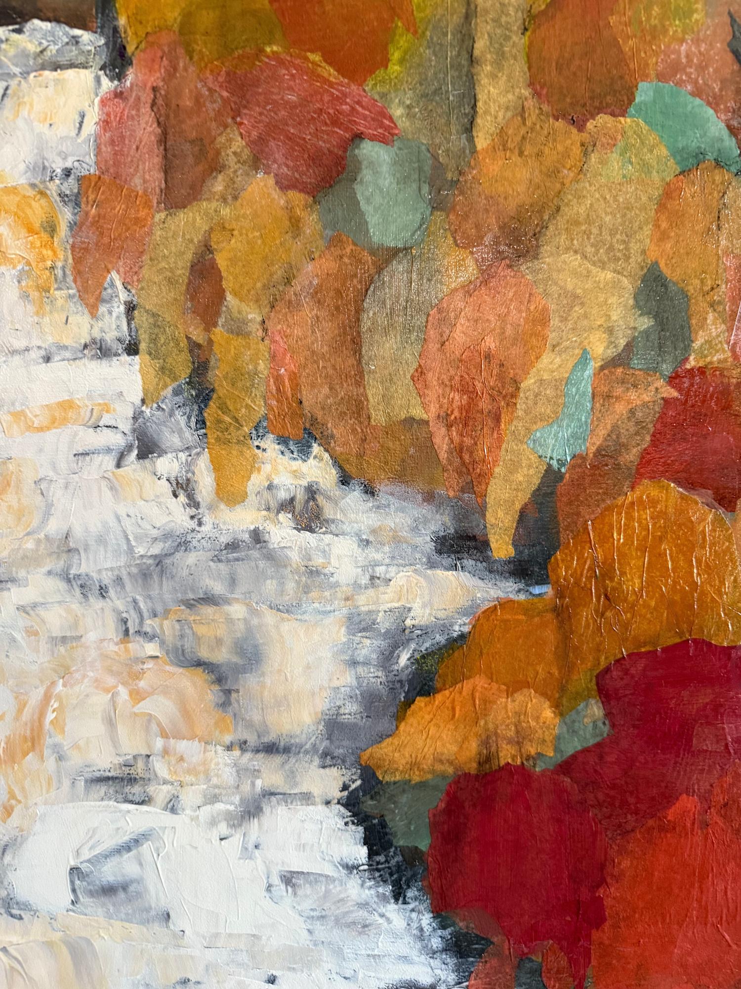 The mixed media artwork presents a vibrant autumn landscape with a flowing river cutting through the center. On both sides of the river, dense clusters of trees are collaged in rich fall colors, including reds, oranges, yellows, and some touches of green. The river that is pouring down is painted with brushstrokes that are textured and expressive, giving the water a dynamic, almost frothy appearance as it moves downstream. The trees are rendered in a layered manner, creating depth through overlapping patches of warm tones. The scene captures the essence of fall with its bold use of color and movement.