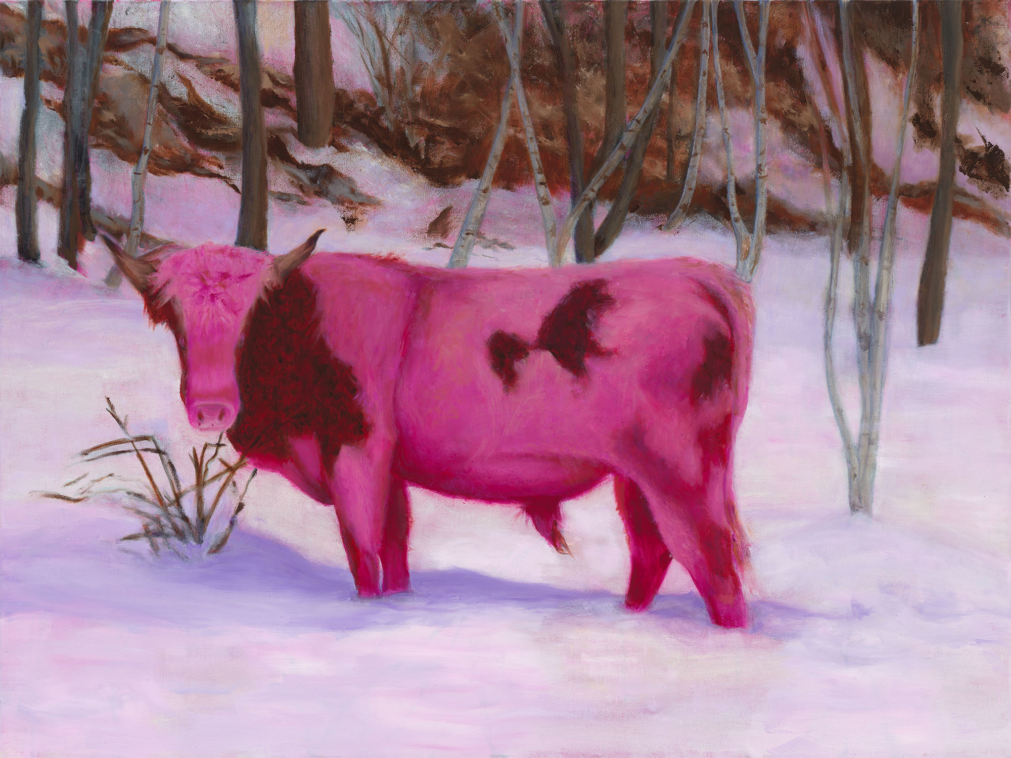 I love the tension that the title, "No Trespassing," creates, because it is not clear if it is the viewer who is trespassing or the bull who has wandered somewhere he should not. -- This is part of my "Winter" series, where I use a lot of pink, blue, and purple and explore contrasts like linear branches etched against snow and sky.