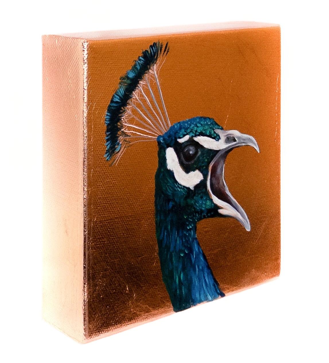 “Boldly Speak Your Brilliance” is an oil painting created over pure copper leaf, where warm metallic textures amplify the lively spirit of a peacock in full expression. The vivid blues and greens shimmer against the radiant surface, and the open beak captures a moment of unapologetic voice and personality. The contrast of color and copper reflects themes of confidence, individuality, and the courage to be seen and heard, inviting viewers to embrace their own brilliance without hesitation.
