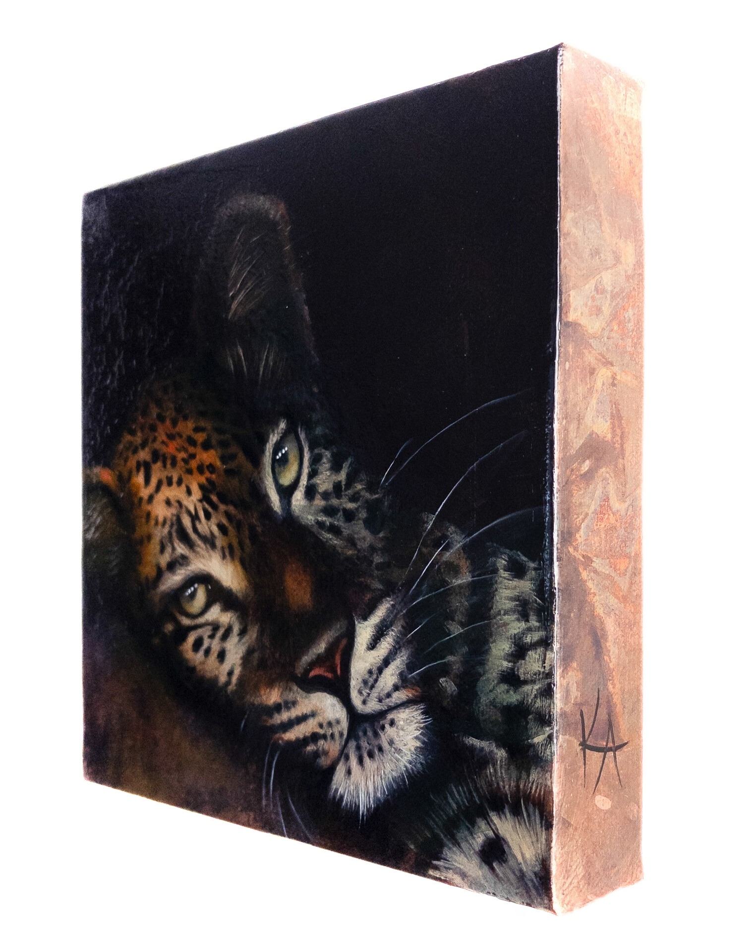 “Fierce Stillness in Quiet Majesty” is an oil painting created over pure copper leaf, where patina and textured marks form a rich backdrop of depth and shadow. The jaguar’s powerful features and patterned rosettes are illuminated by warm light, emerging from the darkness with quiet confidence. The contrast between the radiant copper surface and the focused gaze evokes poise, resilience, and the noble strength found in stillness, inviting reflection on the wild beauty that thrives in silence.