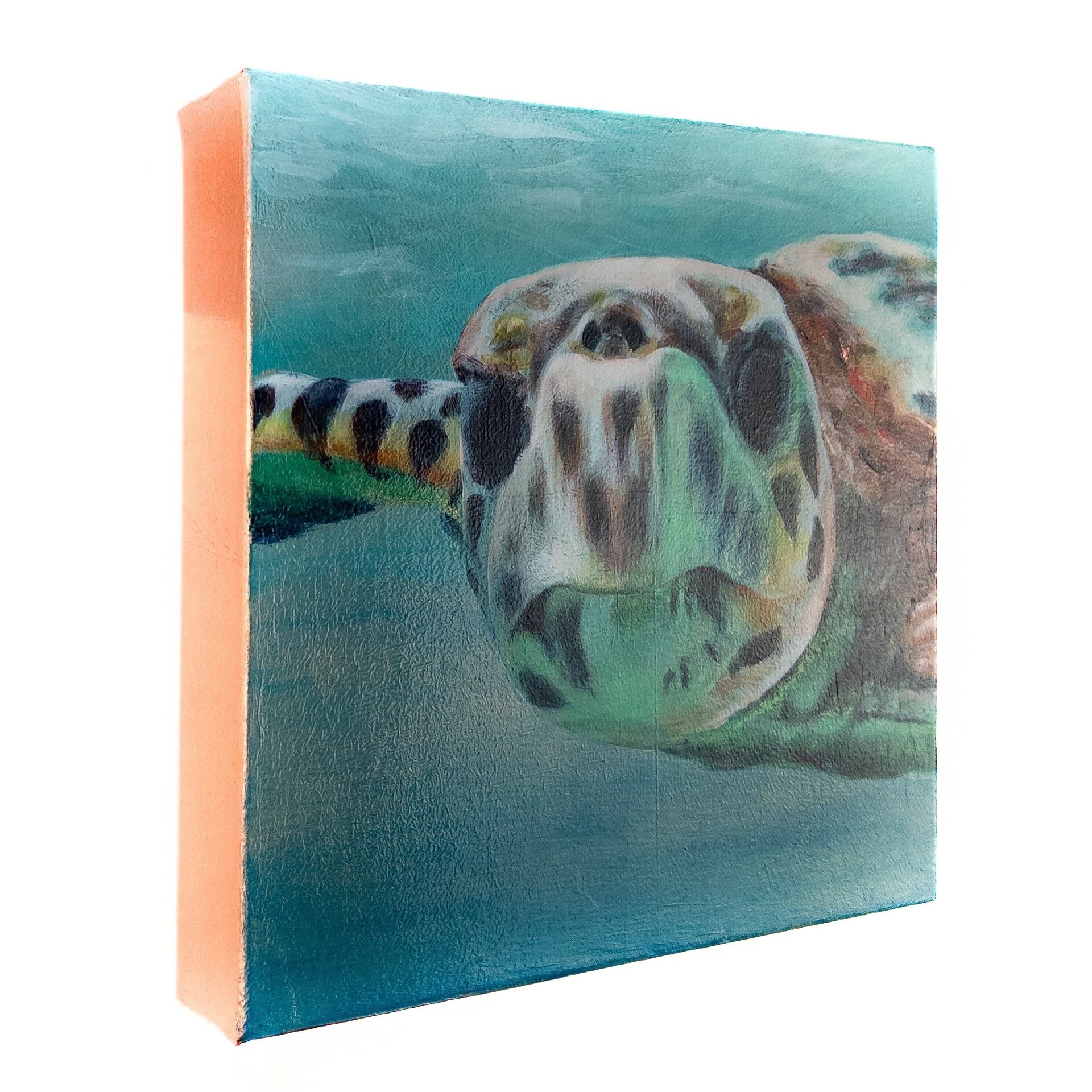 “In the Flow of Forever” is an oil painting that captures a close meeting with a sea turtle, its mottled shell and gentle expression rendered with careful detail. The cool blue water surrounds the subject in soft light, emphasizing the graceful movement and timeless presence of this ocean wanderer. The serene gaze of the turtle invites reflection on endurance, wisdom, and the deep connection shared between life and the ever moving currents of the sea.