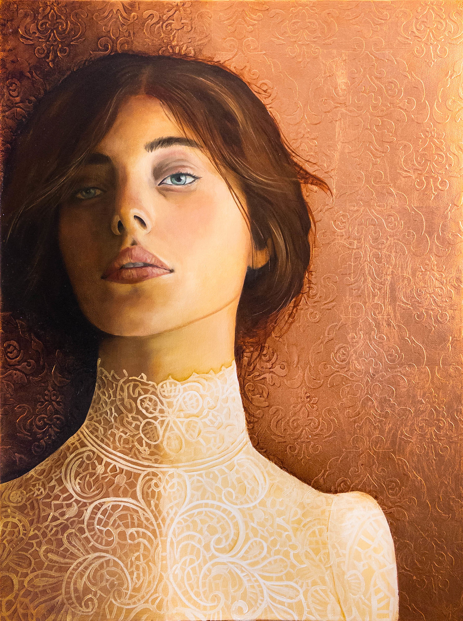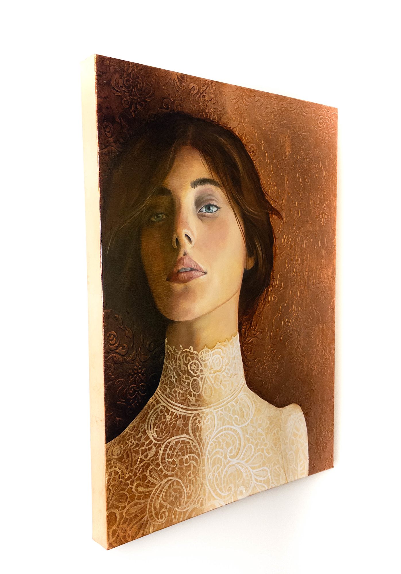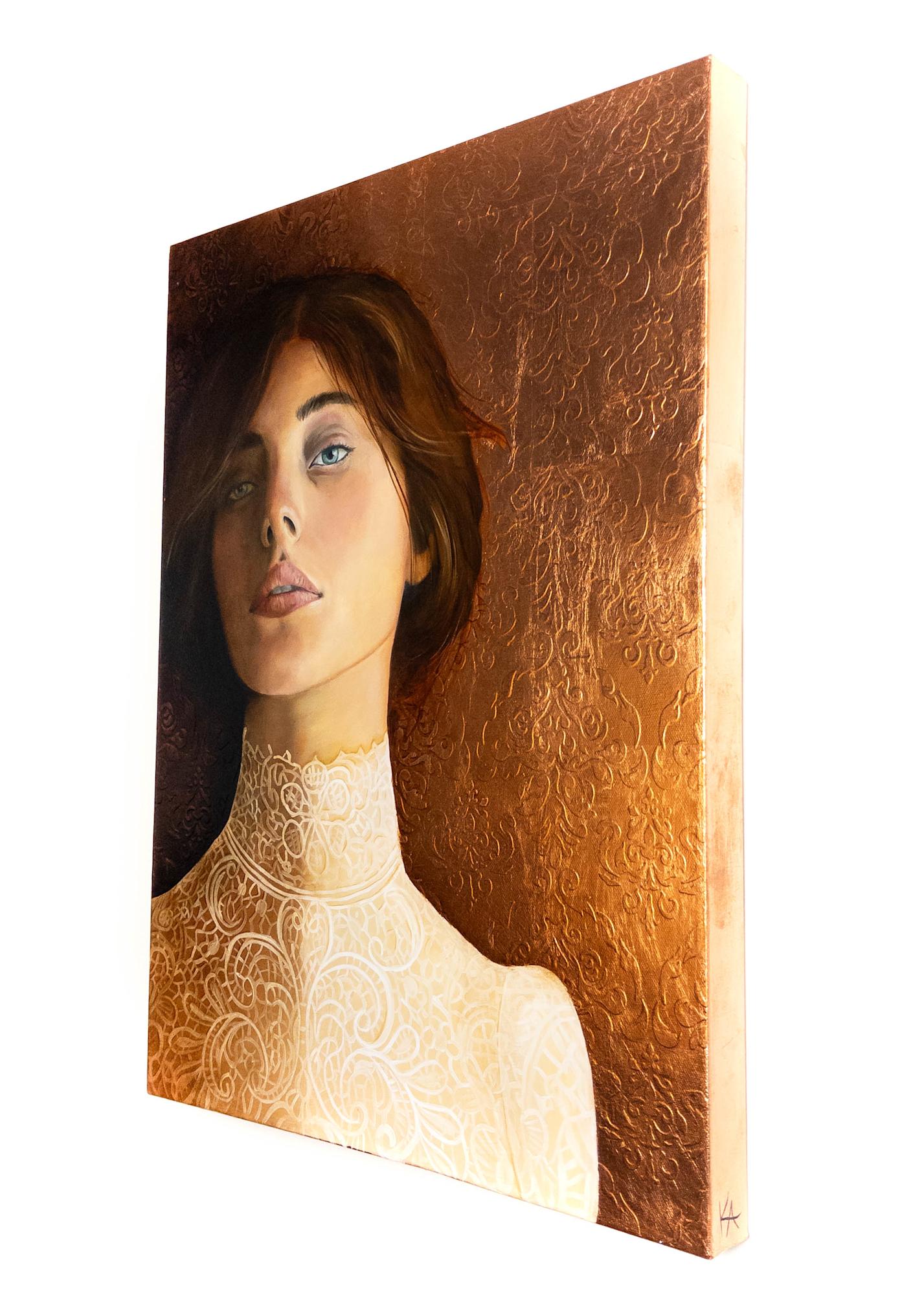Luminous Resolve is an oil painting created over copper leaf, with an embossed pattern adding detail and depth to the background. The figure’s steady gaze contrasts with the delicately painted lace at her neckline, balancing strength and refinement. The warmth of the copper enhances the palette, allowing subtle patina tones to show through. This work reflects an enduring sense of resilience and calm presence.