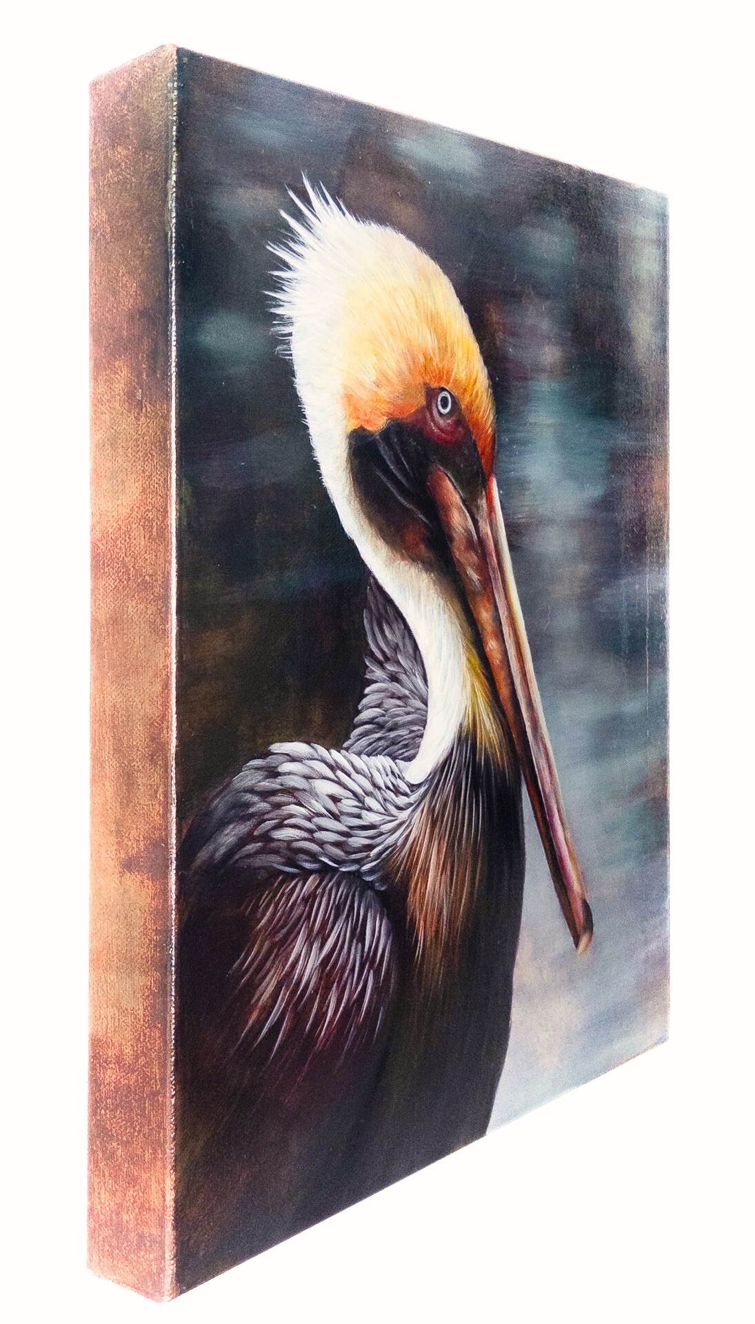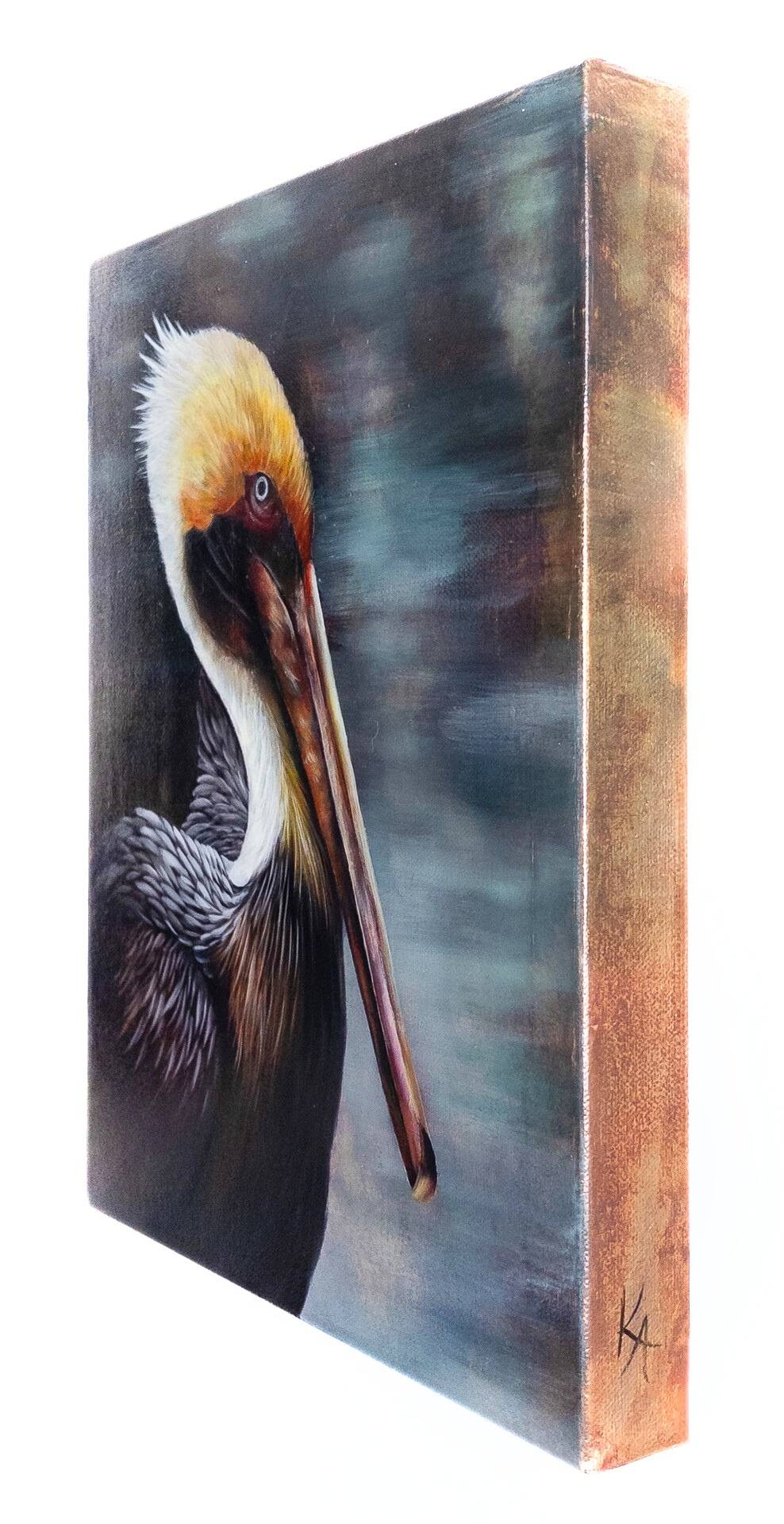 “Noble Watcher, Crowned with Dignity” is an oil painting created over pure copper leaf, where soft patina and layered brushwork form a shimmering backdrop reminiscent of light on coastal water. The Brown Pelican stands in elegant profile, its golden head and textured feathers rendered with careful detail. The serene posture and focused gaze evoke resilience, grace, and the quiet authority of a creature shaped by wind and tide, inviting reflection on the noble beauty that thrives along the shore.
