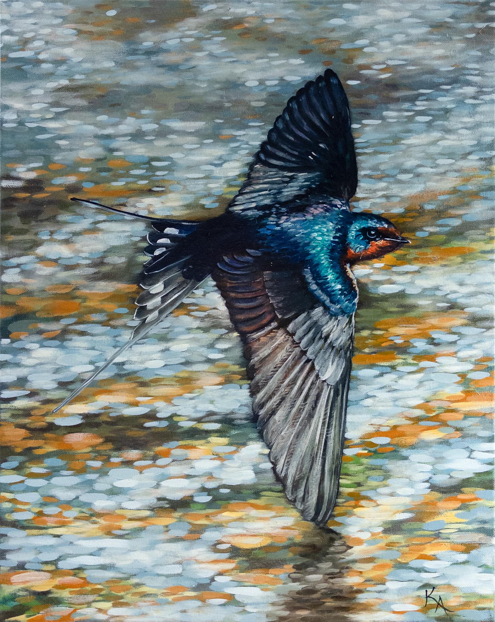 This painting captures a swallow soaring above a tranquil body of water. The bird's wings spread wide, cutting through the air with an effortless elegance, while the water below mirrors the scene, dappled with glints of amber, gold, and green from the surrounding autumn foliage. The brushwork is bold and expressive, with mark-making techniques that create a sense of motion and fluidity.