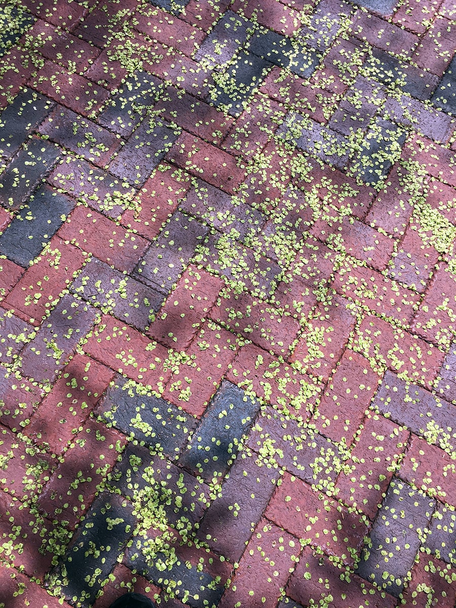 Green tree seed pattern on the brick sidewalk in downtown St Charles, IL and I really liked the abstract that it made.